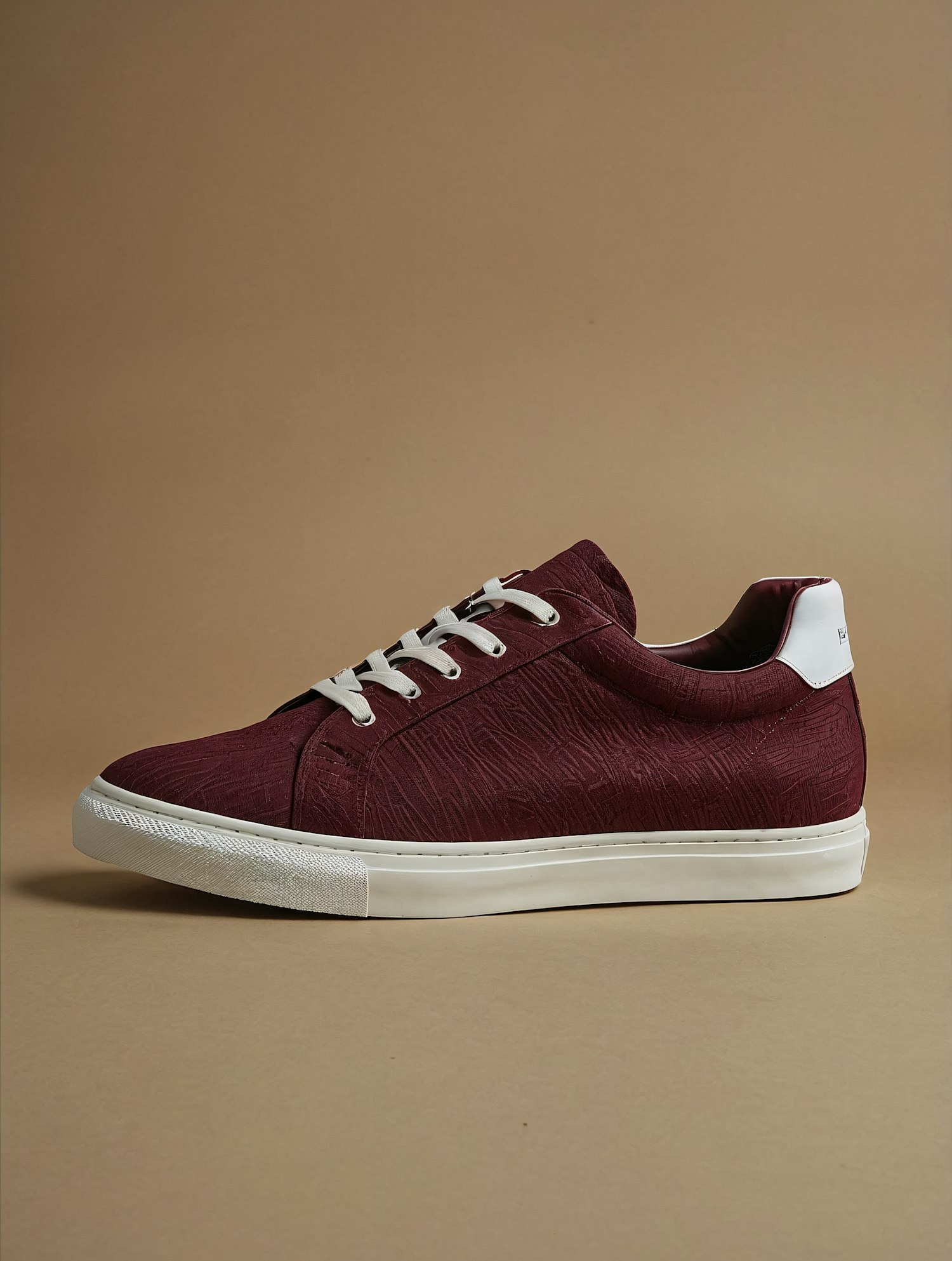 Maroon textured sneakers with white laces and sole, perfect for casual or semi-formal looks. Sleek design with subtle branding on the heel.