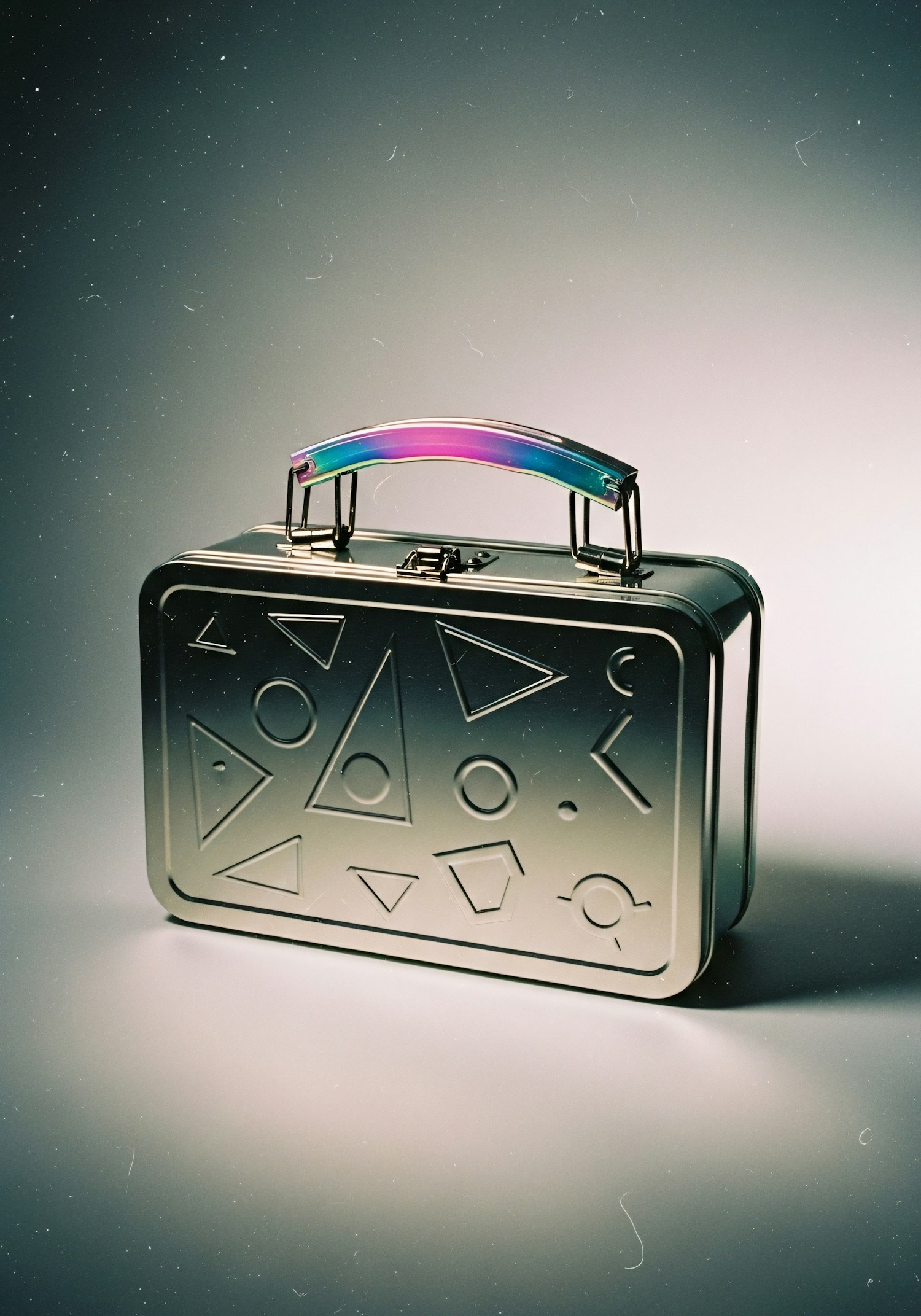 Stylish metallic lunchbox with embossed geometric shapes and an iridescent handle, perfect for a modern and functional accessory.