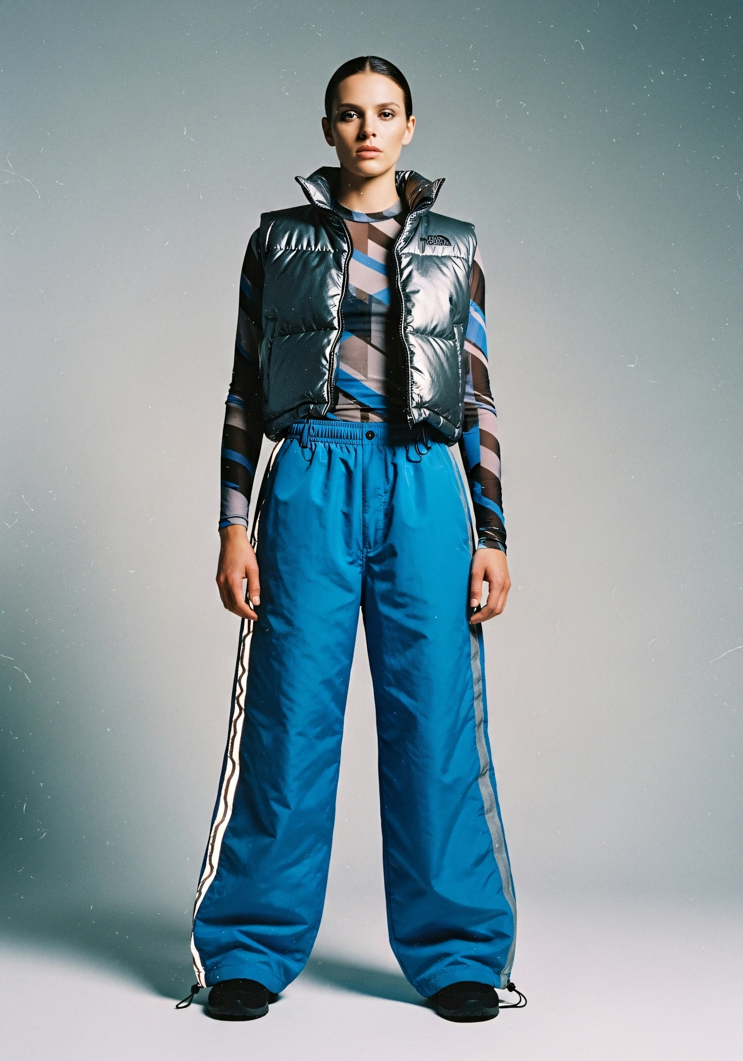 A stylish individual in a silver puffer vest and blue pants stands confidently against a neutral background.