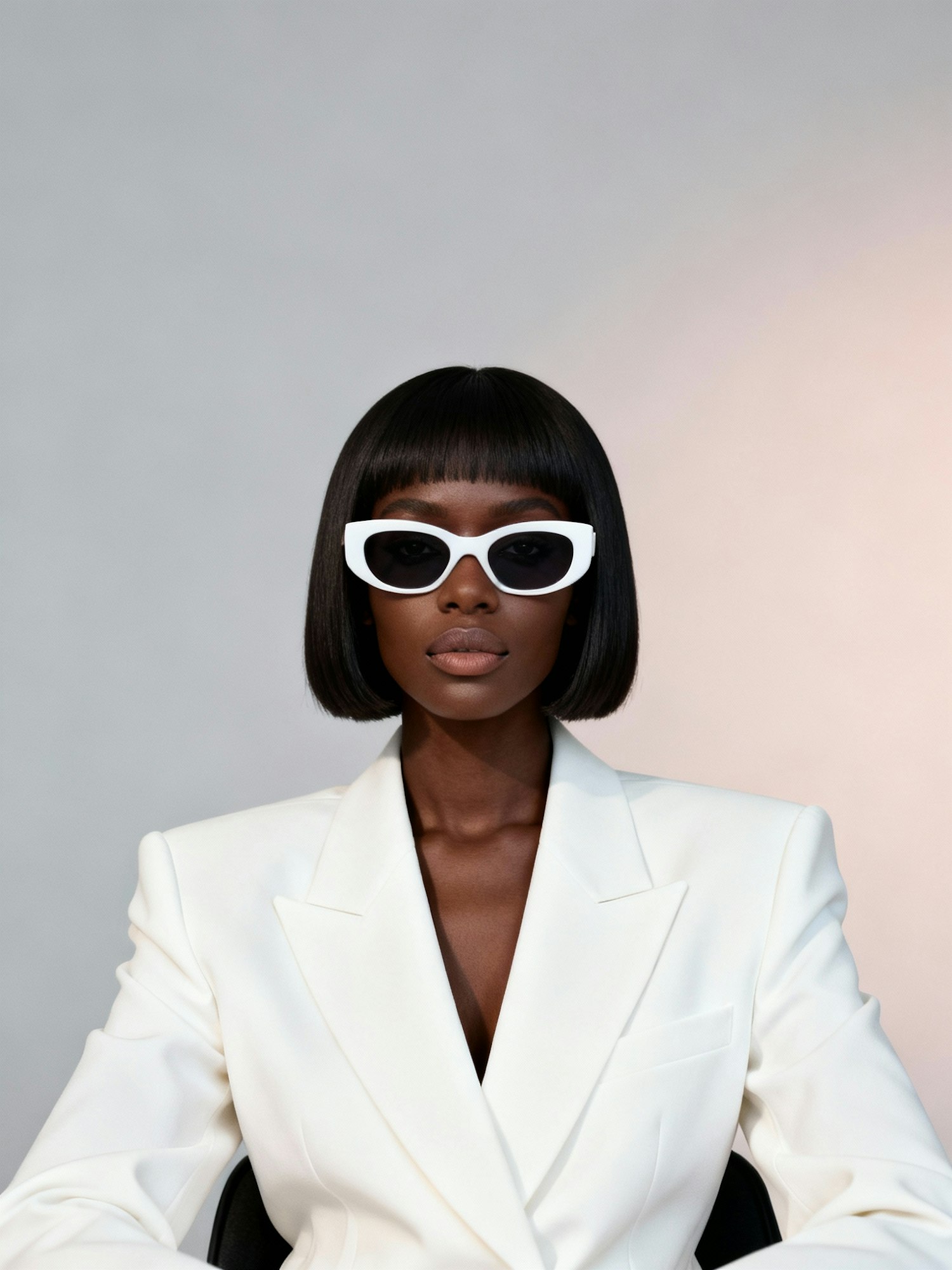 Waist-up, high-definition studio portrait of a chic Black woman posed against a soft gradient background. The camera angle is centered and slightly low, capturing her with sculptural clarity and editorial poise. She sits upright with relaxed shoulders and a composed gaze, exuding quiet confidence and modern edge. She wears a sharp white blazer with clean tailoring and structured shoulders, paired with oversized white sunglasses that add bold contrast and minimalist drama. Her hair is styled in a sleek bob, framing her face with precision. Makeup is polished and understated—matte skin, soft contouring, and a neutral lip. Lighting is soft and diffused, casting subtle highlights across her cheekbones and blazer folds. The overall mood is clean, modern, and visually striking—ideal for a fashion editorial or visual archive celebrating Afro-fusion minimalism and contemporary identity.