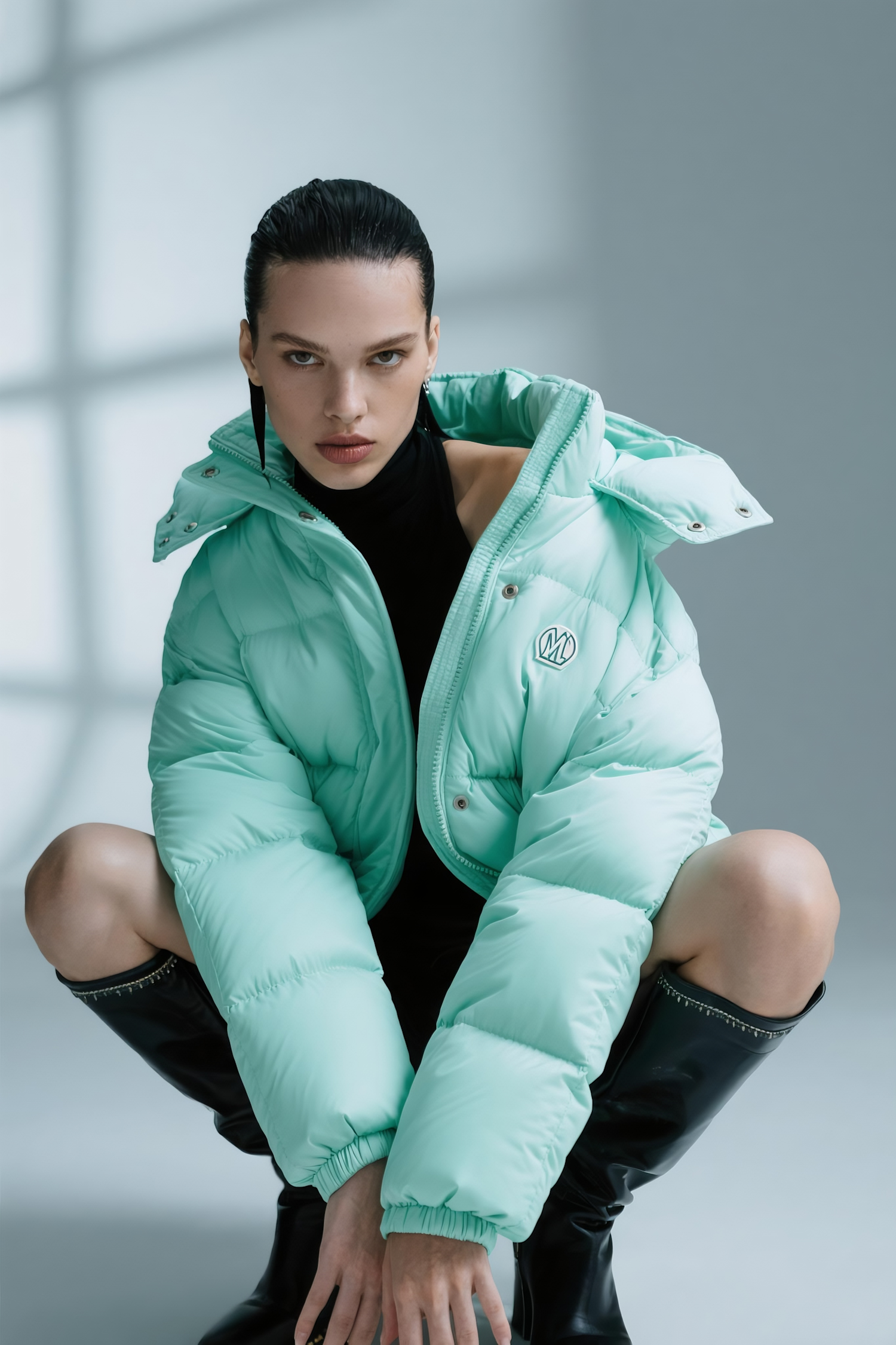Stylish individual in a mint green puffer jacket and black boots, striking a bold pose against a minimalist background.