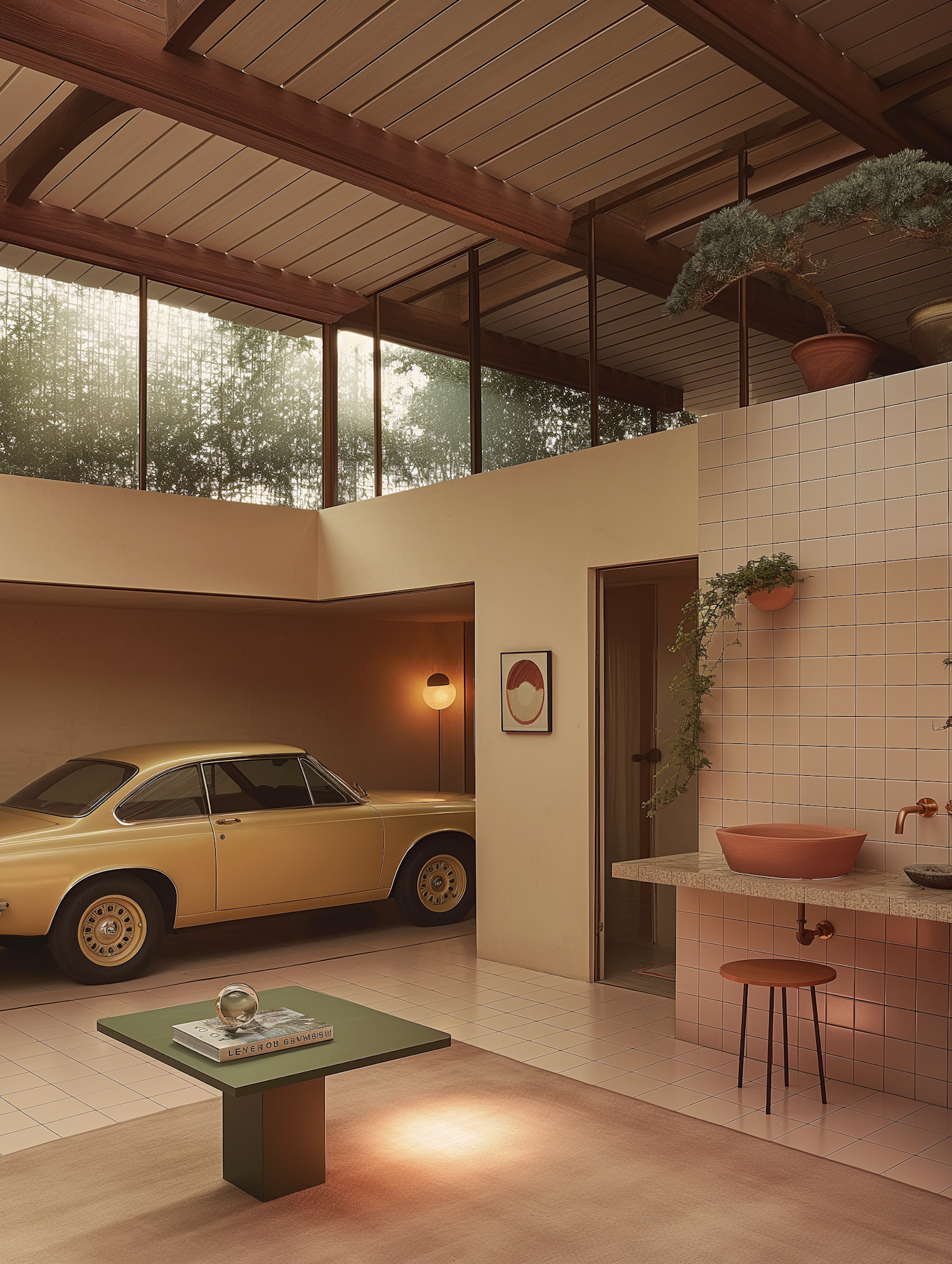 Mid-century modern interior with vintage yellow car, large windows, and stylish decor. Features a green table, tiled wall, and potted plants.