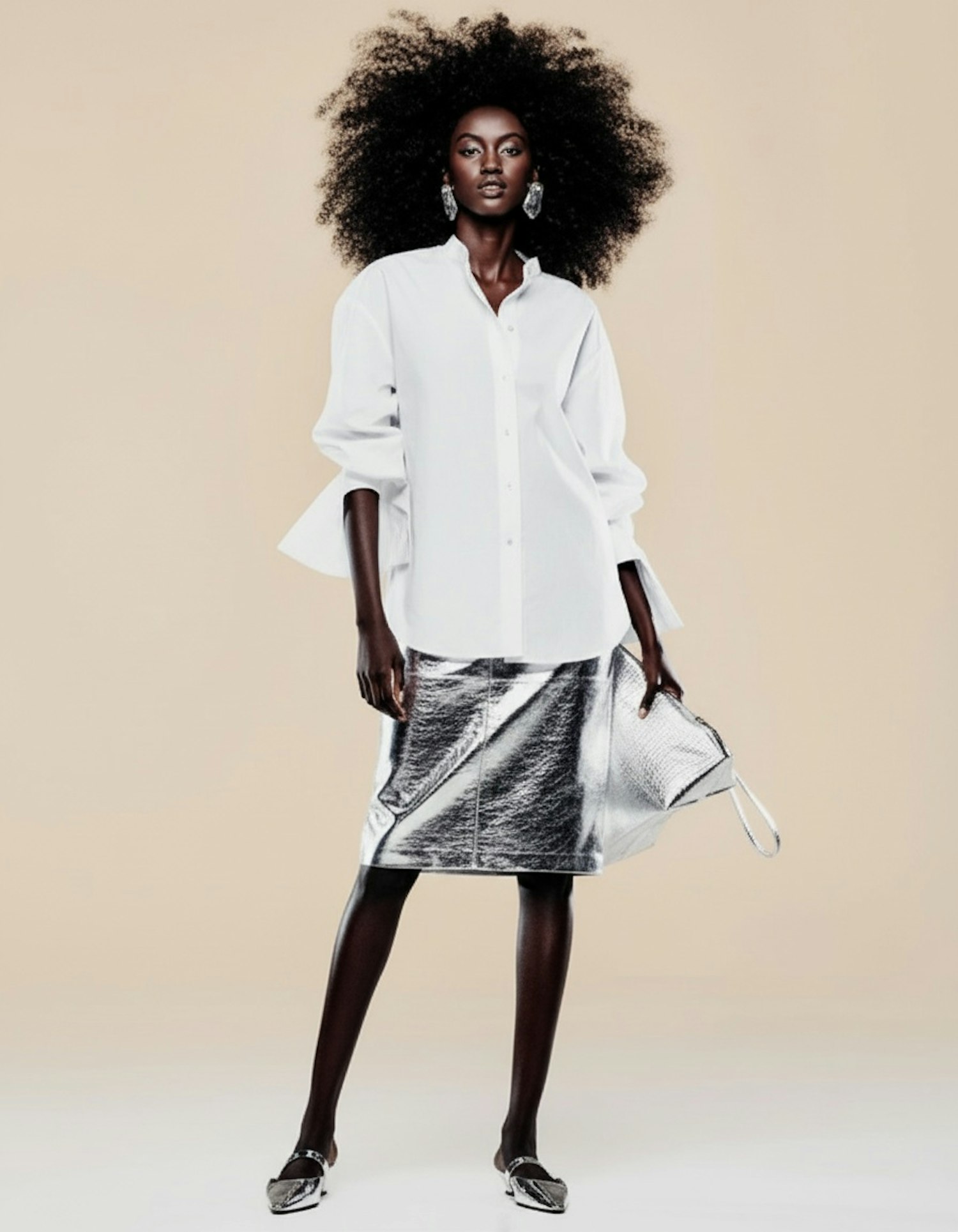 A fashionable individual in a white shirt and metallic silver skirt, accessorized with statement earrings, stands against a neutral background.