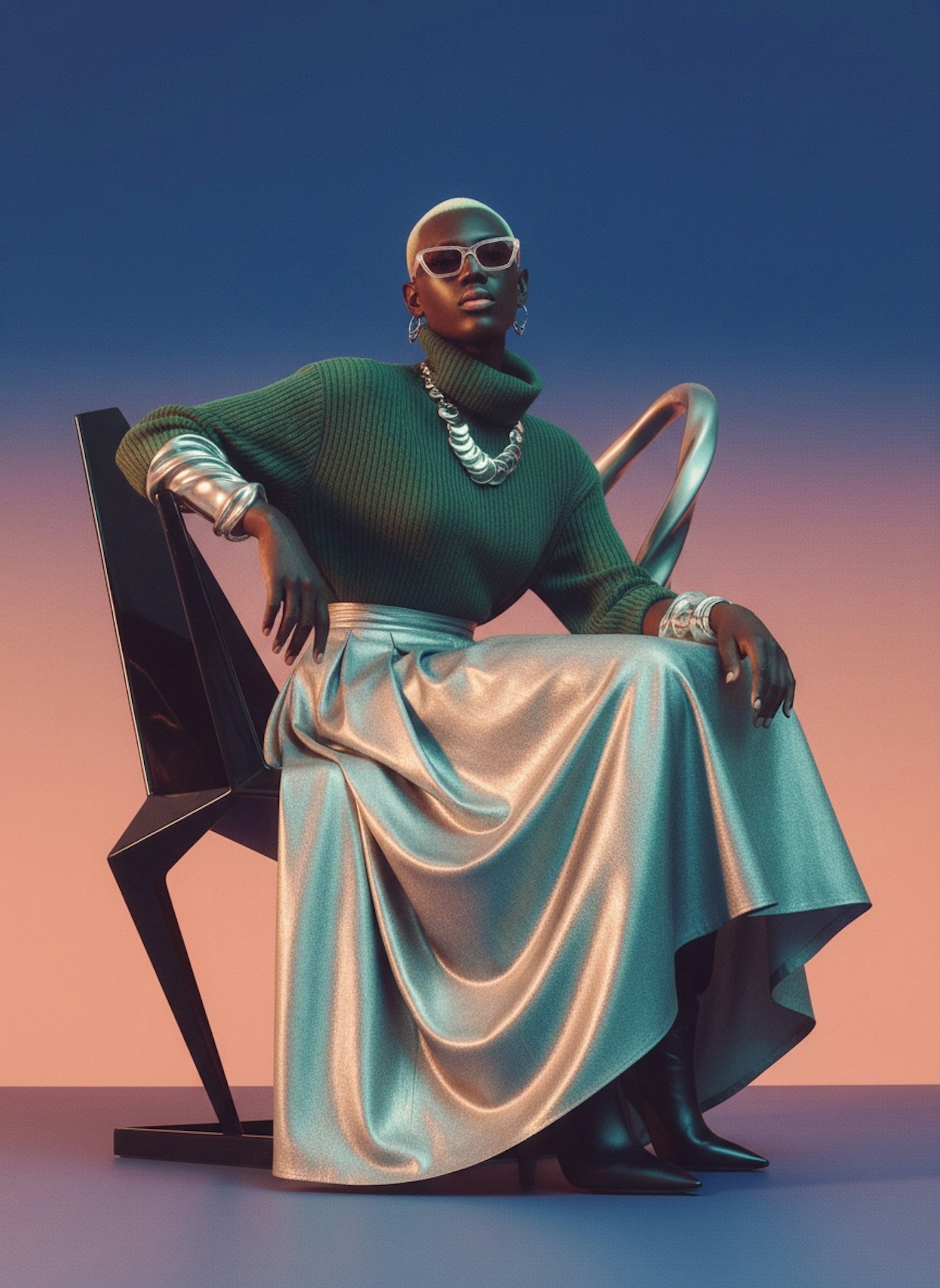 A fashionable person in a green sweater and silver skirt sits on a modern chair against a gradient background, exuding style and elegance.