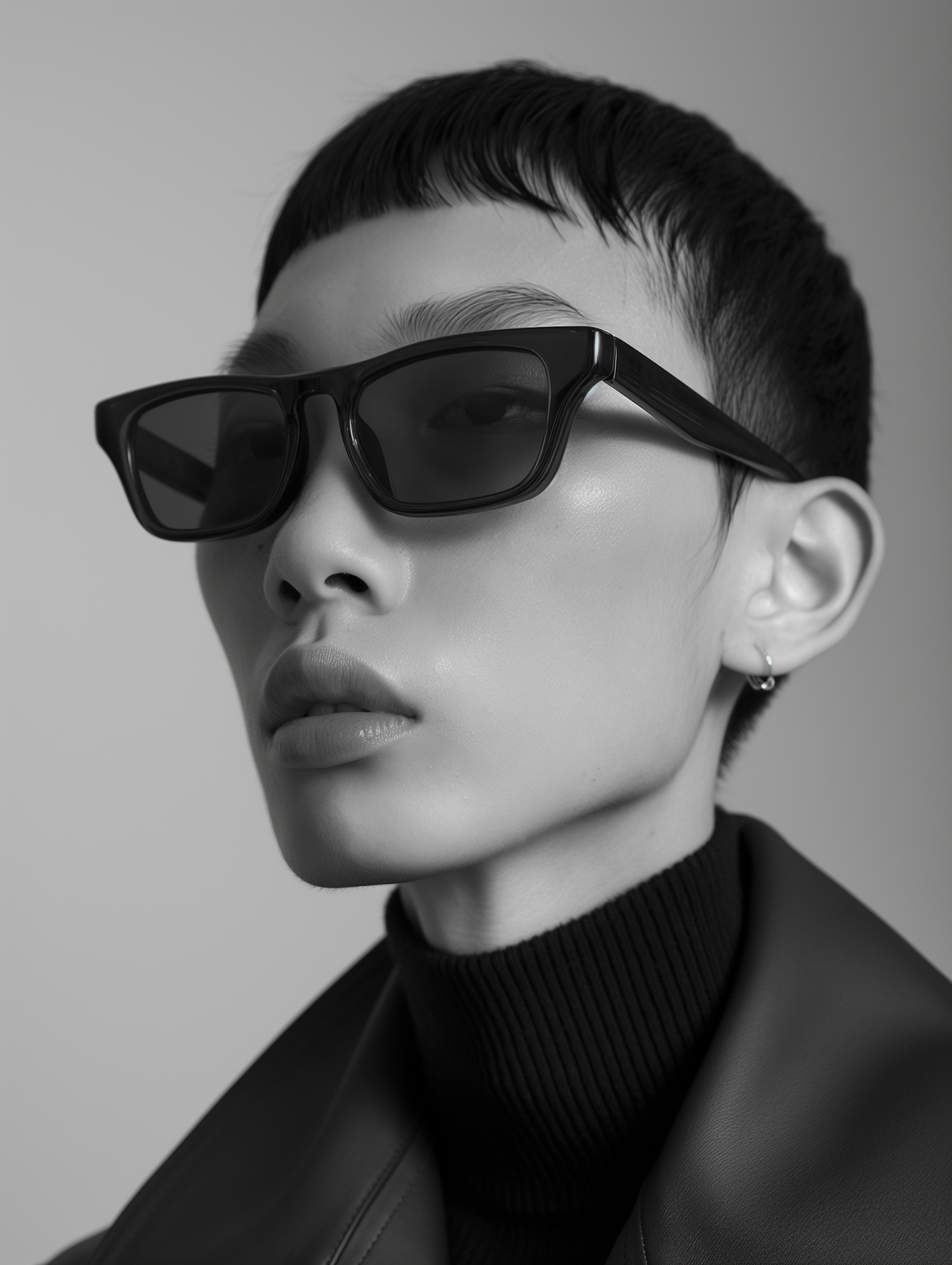 Stylish black and white portrait of an Asian individual in sunglasses, exuding modern elegance with a leather jacket and sleek hairstyle.