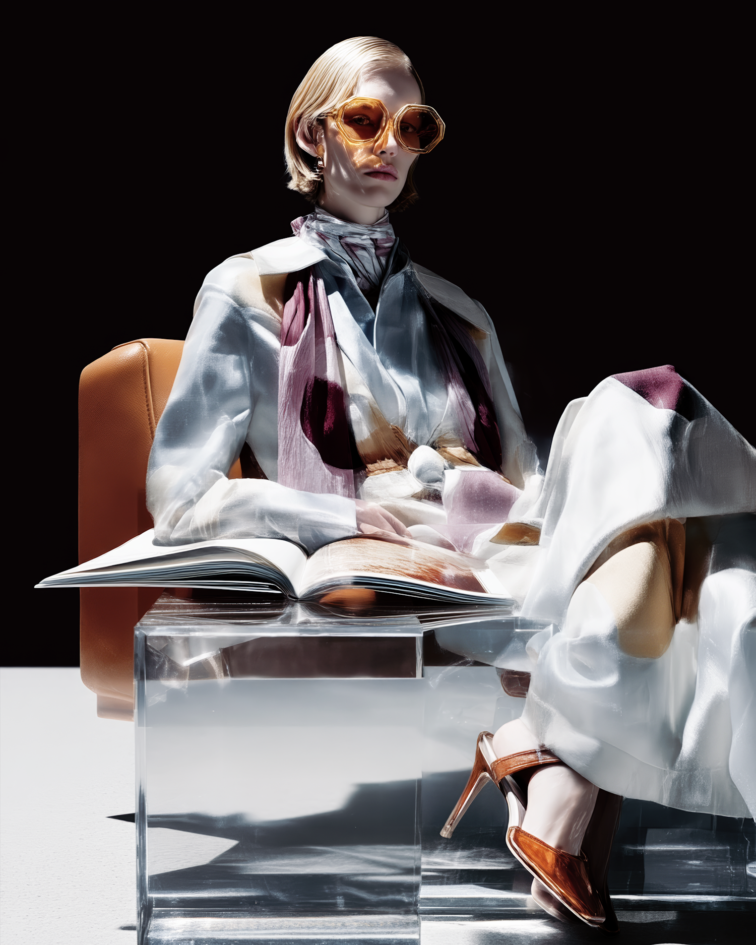 A fashionable person in a patterned outfit and orange sunglasses sits with an open book, set against a dramatic dark background.