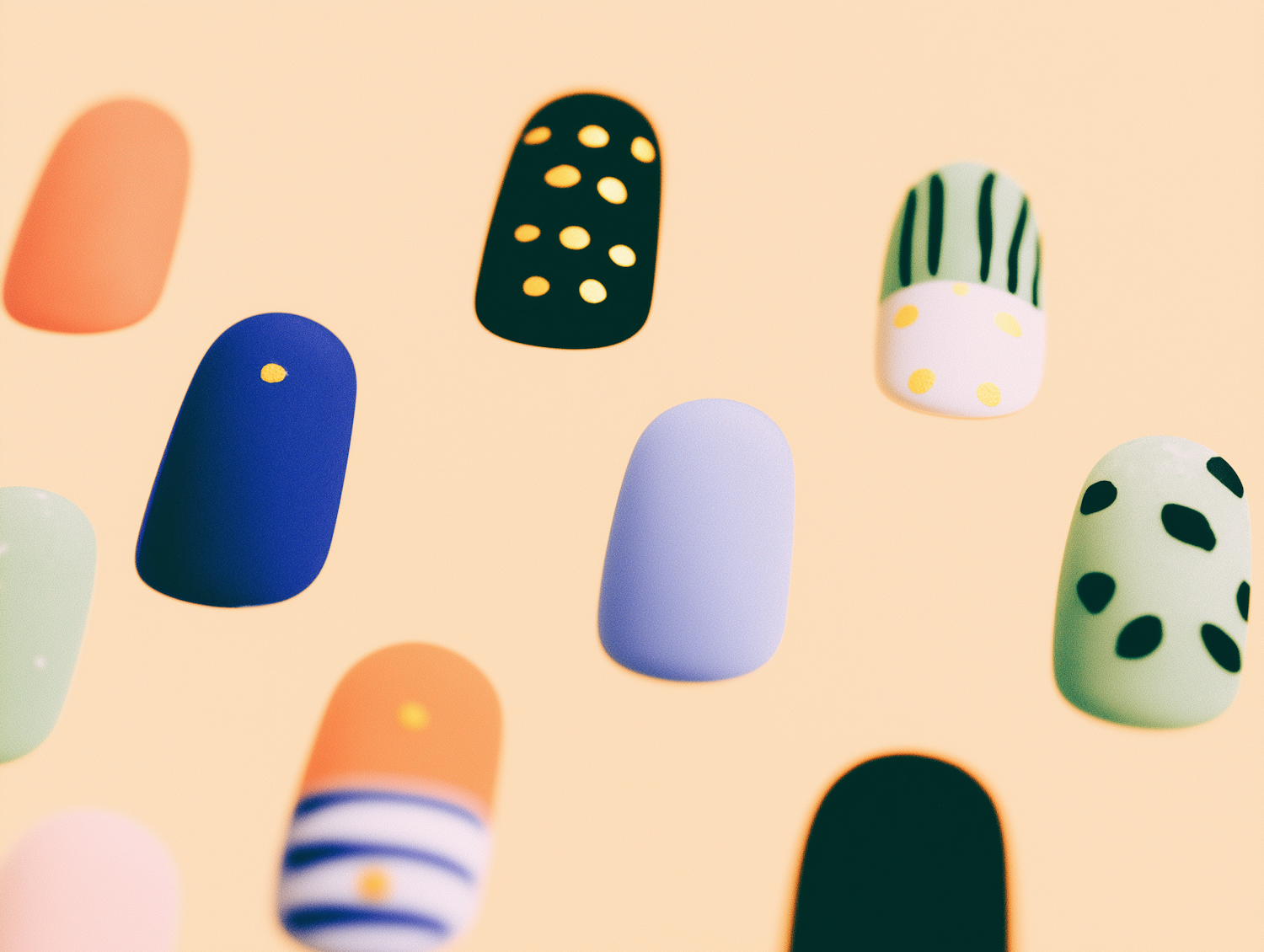 A colorful nail sampler on a stylish pastel background, showcasing creativity with polka-dots, stripes, and more.