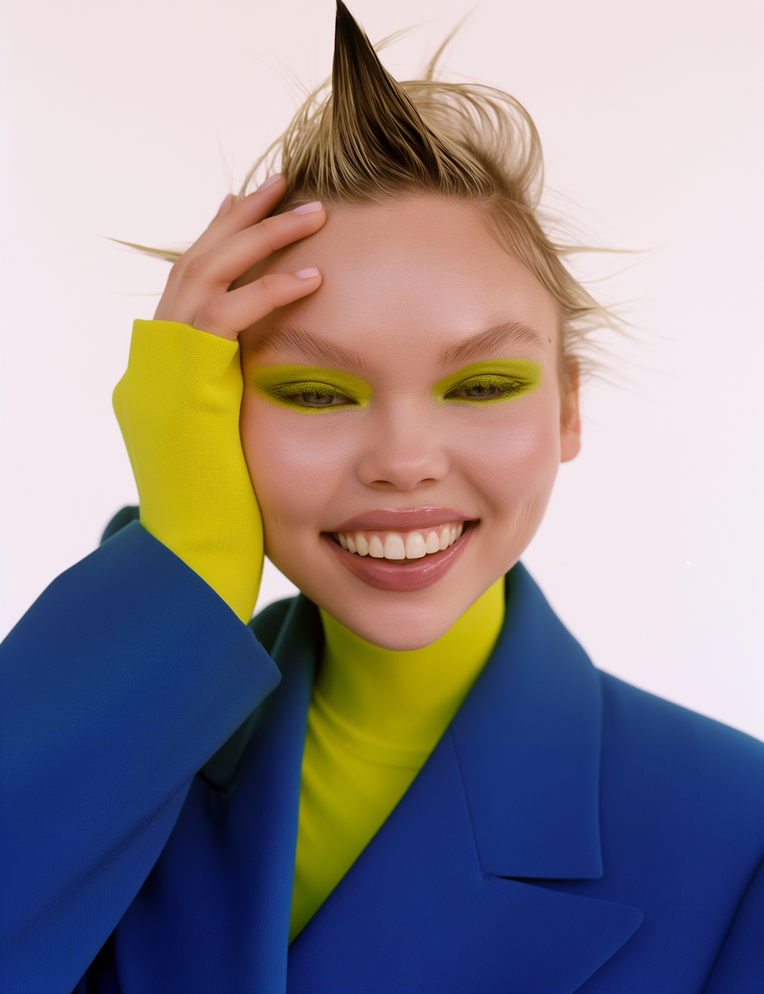 Bright and bold portrait of a woman with spiked blonde hair, neon green eyeshadow, and a vibrant blue blazer over a green turtleneck.