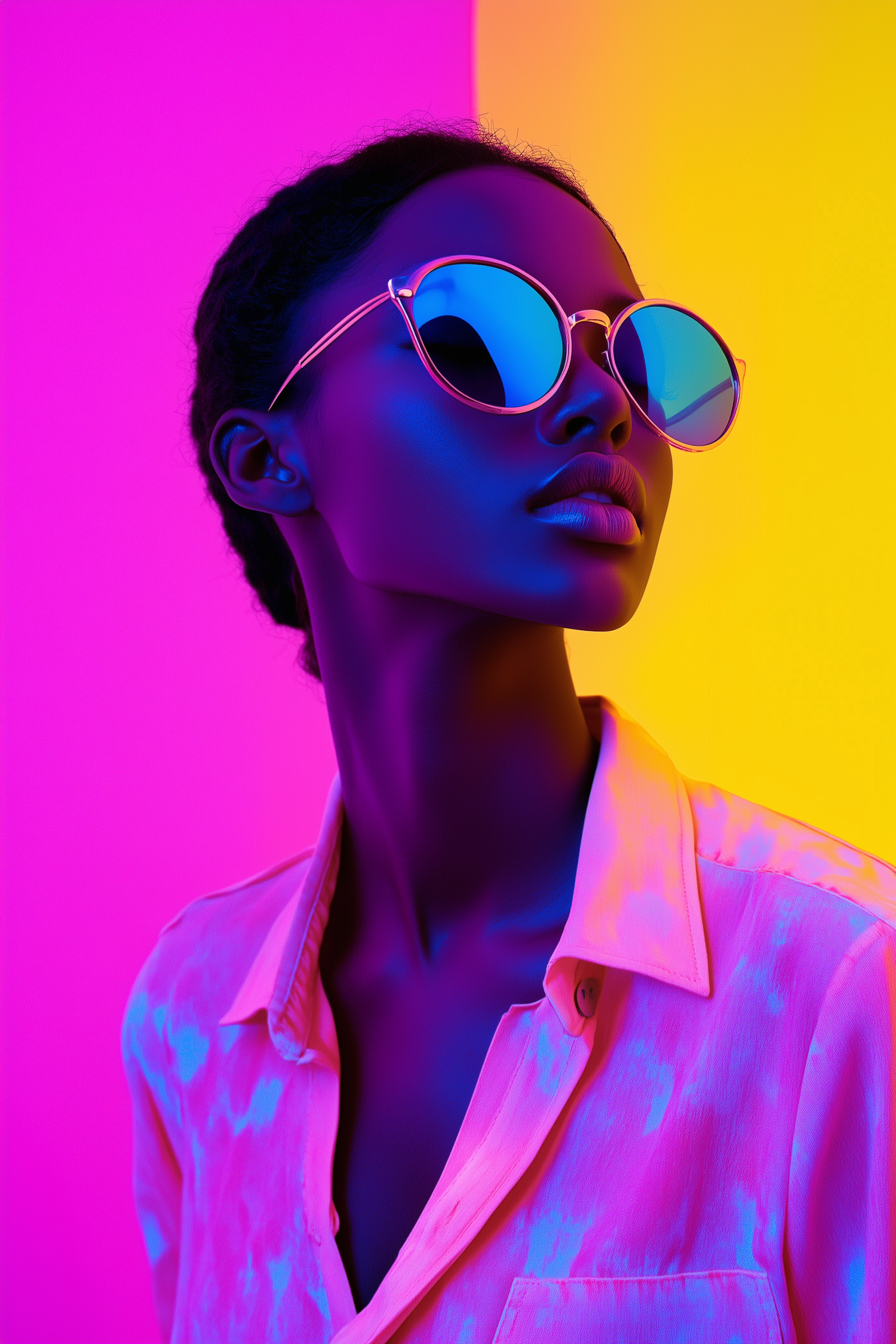 Vibrant portrait of a woman in reflective sunglasses, neon lighting, and a bold pink-yellow gradient background. Futuristic and artistic vibe.