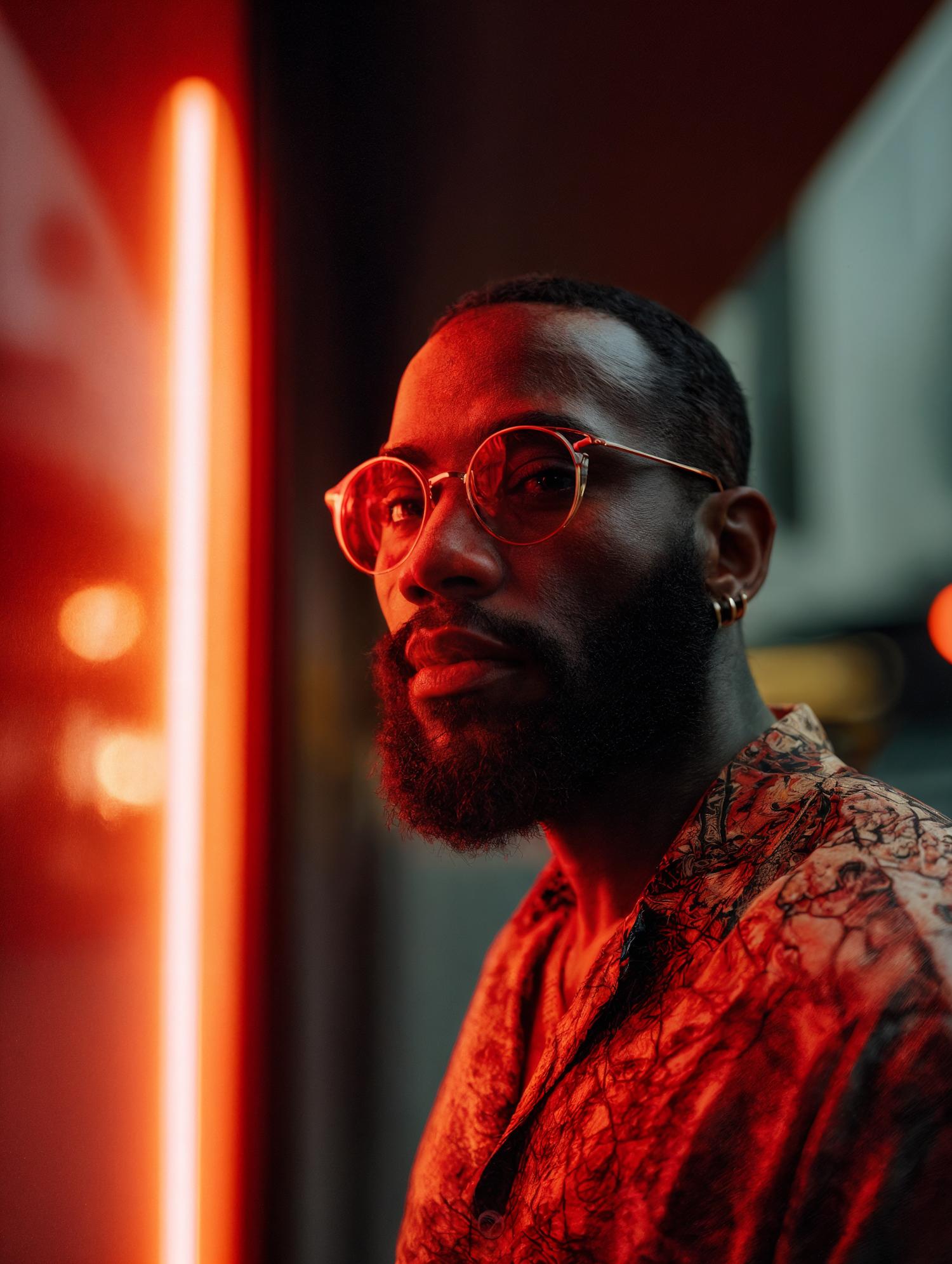Stylish man in glasses illuminated by red neon light, wearing a patterned shirt in an urban setting. Modern and dramatic portrait.