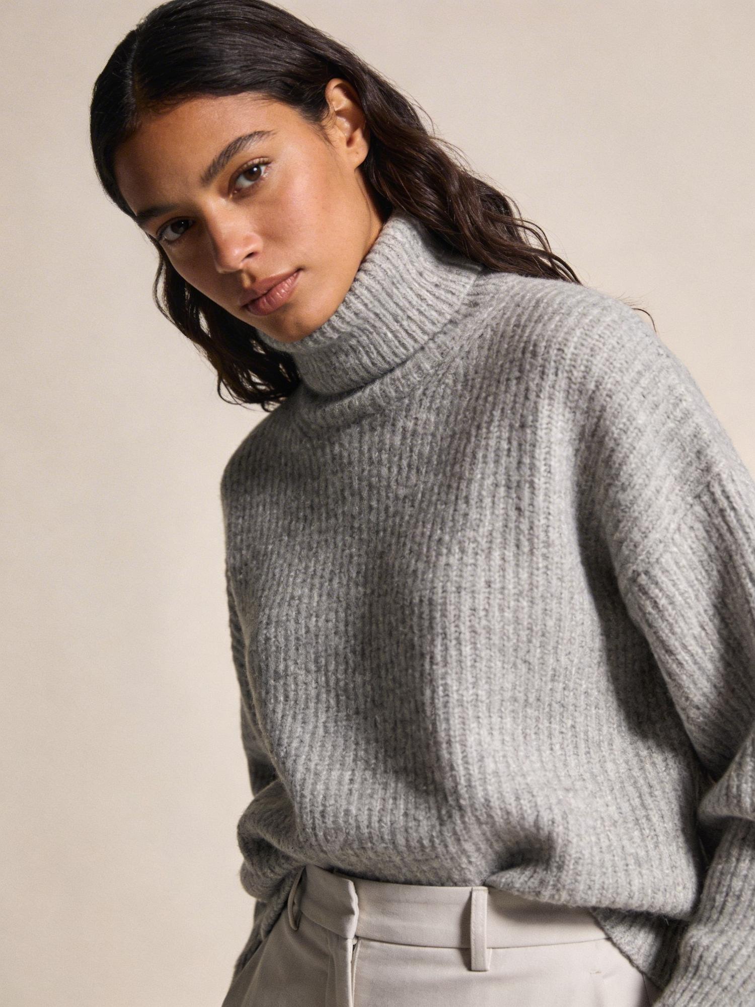 Studio portrait, Scandi-minimal fashion editorial, female mid 20s; medium tan skin; long soft natural waves with center part. Outfit: chunky light-gray ribbed turtleneck knit sweater with relaxed fit, paired with light stone tailored trousers (waistline visible), no logos. Framing: waist-up; angle: slight 3/4. Solid pale greige seamless backdrop. Rembrandt lighting with soft fill; 105 mm macro-sharp. Expression: serene, effortless, eyes to camera.