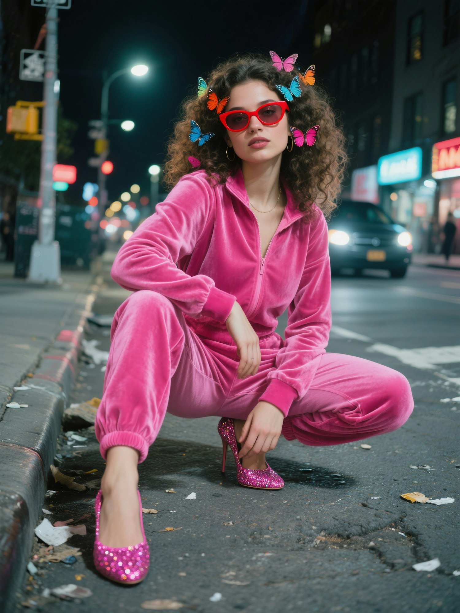 Girl in bright pink velour tracksuit, sitting low on the street at night, butterfly clips in curly hair, rimless red sunglasses, sparkly pink heels, lit by flash photography, taken on iPhone.