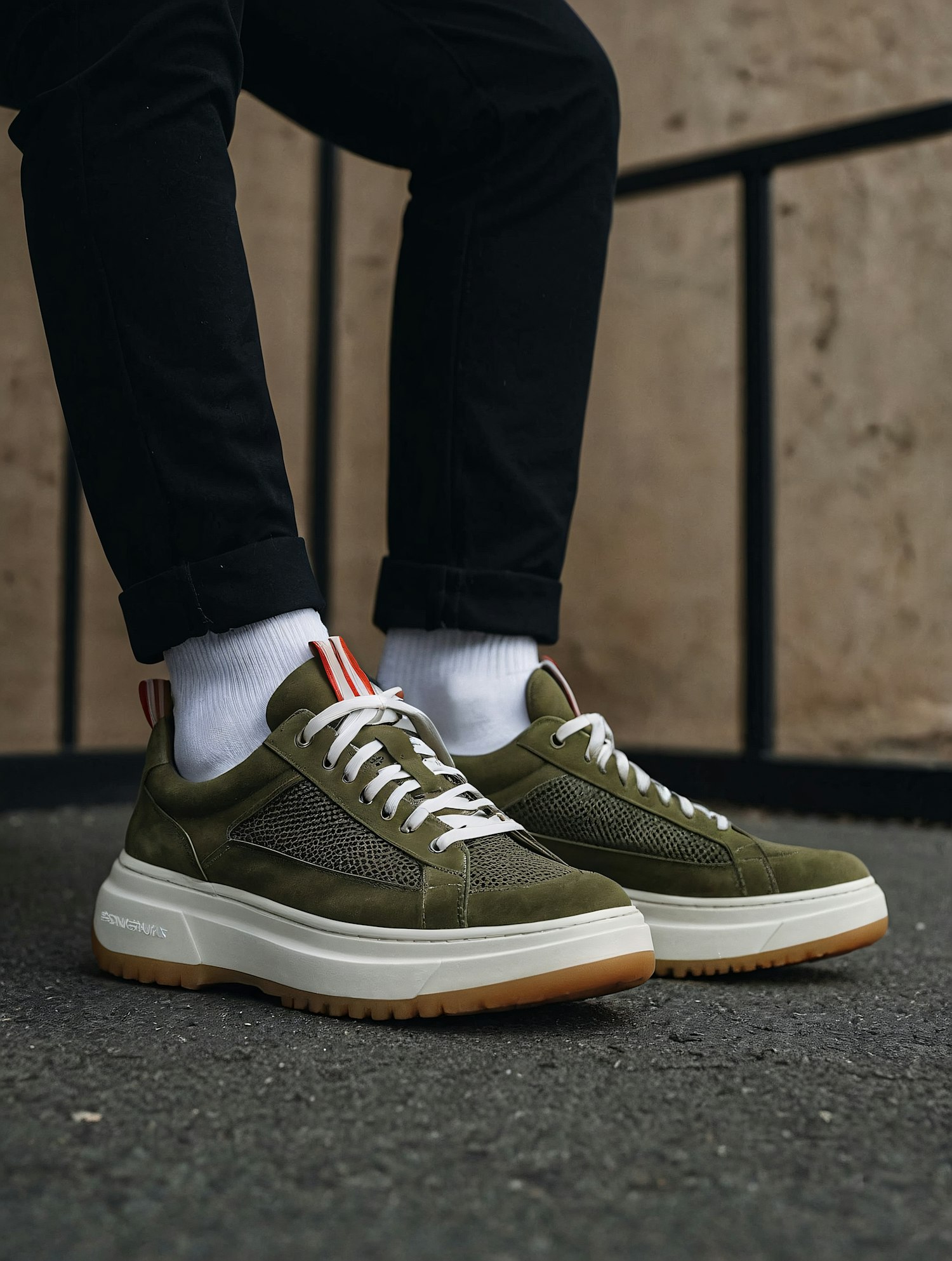 Stylish olive green sneakers with white laces, gum soles, and mesh details paired with black pants and white socks on an urban backdrop.