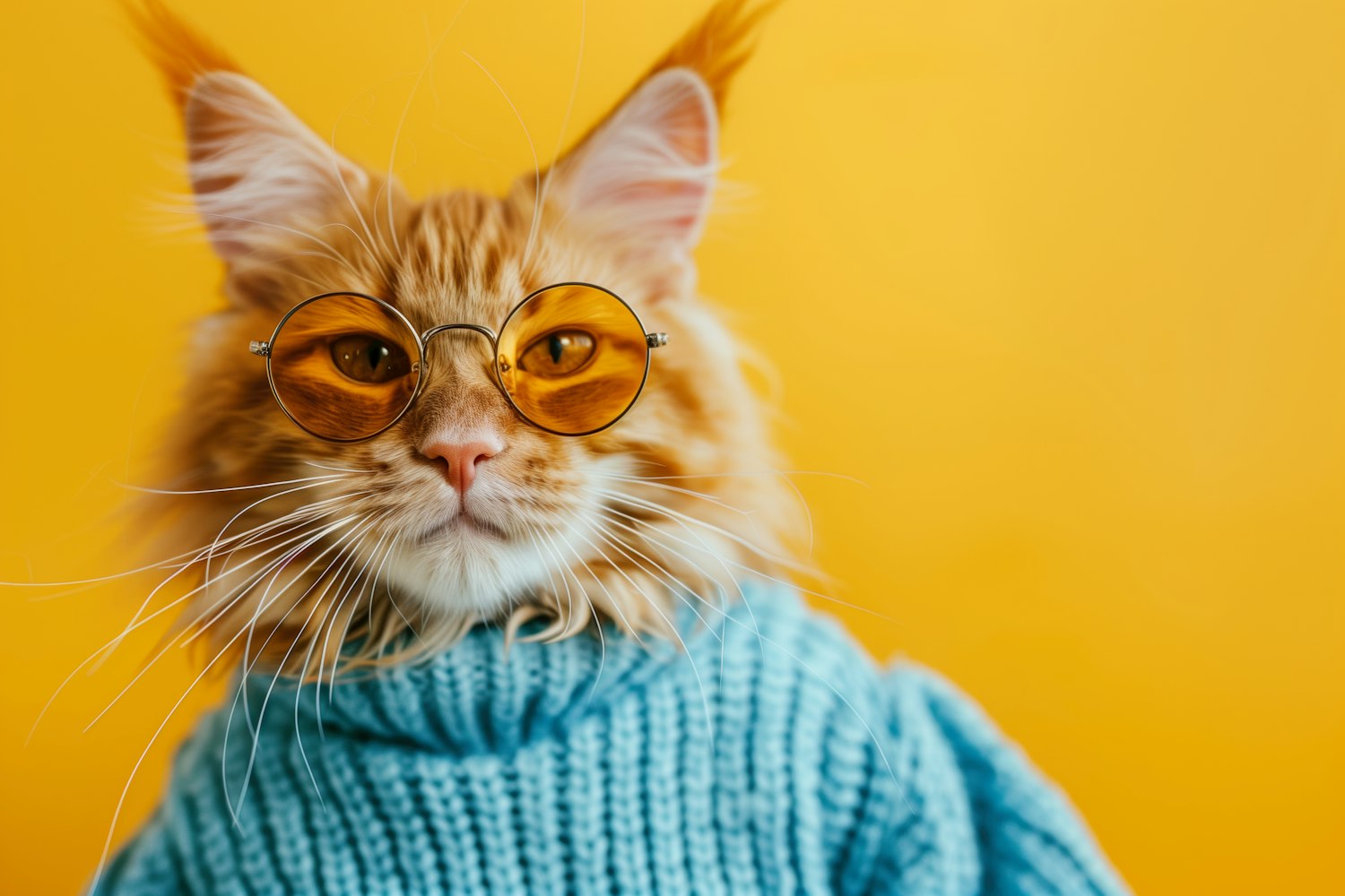 Stylish orange cat in sunglasses and blue sweater against a vibrant yellow background.