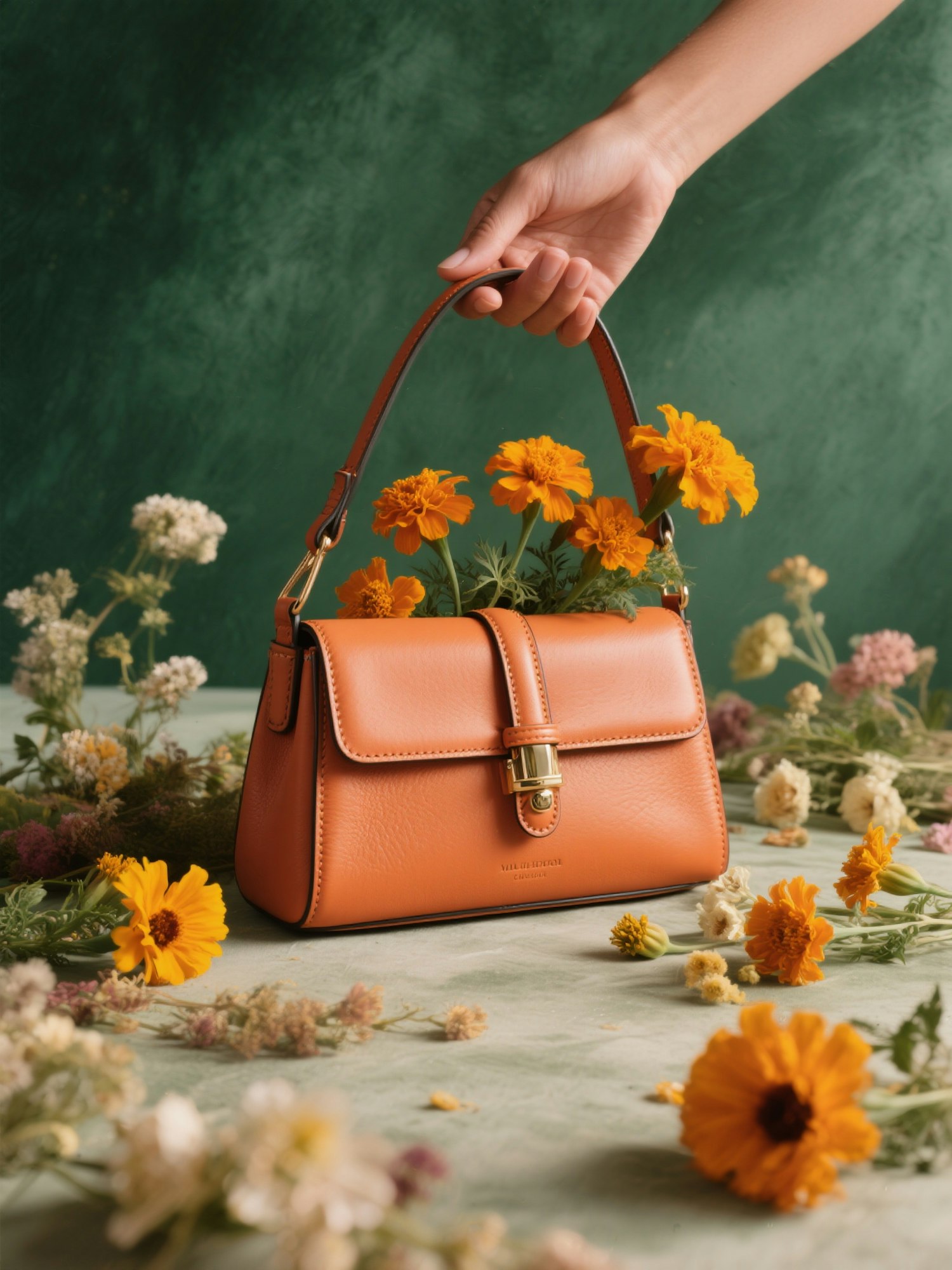 Elegant orange leather handbag with gold clasp, surrounded by vibrant flowers on a green backdrop. Perfect blend of style and nature.