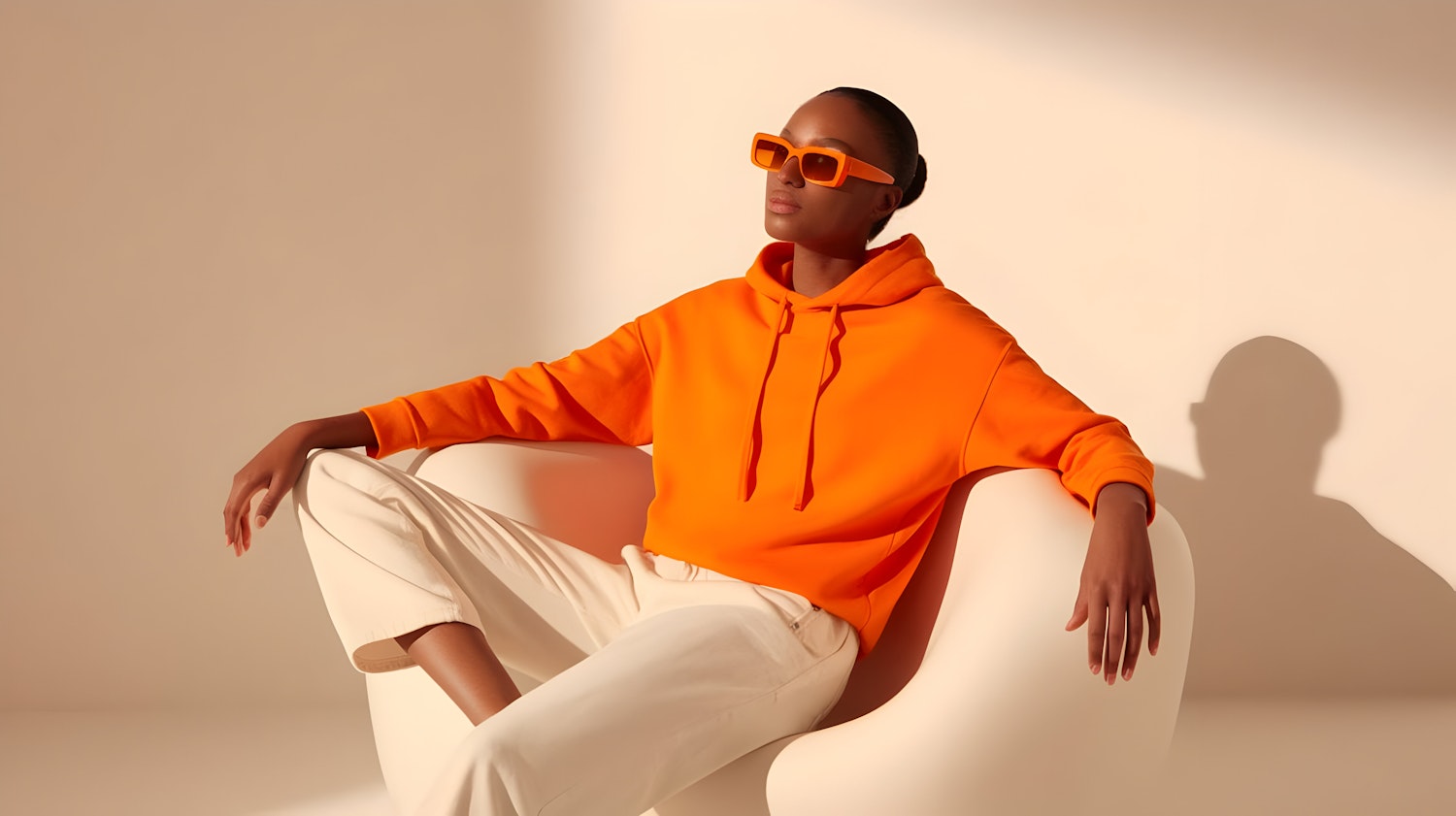 Minimalist fashion shot of a person in an orange hoodie and matching sunglasses, seated in a modern chair with a neutral background.