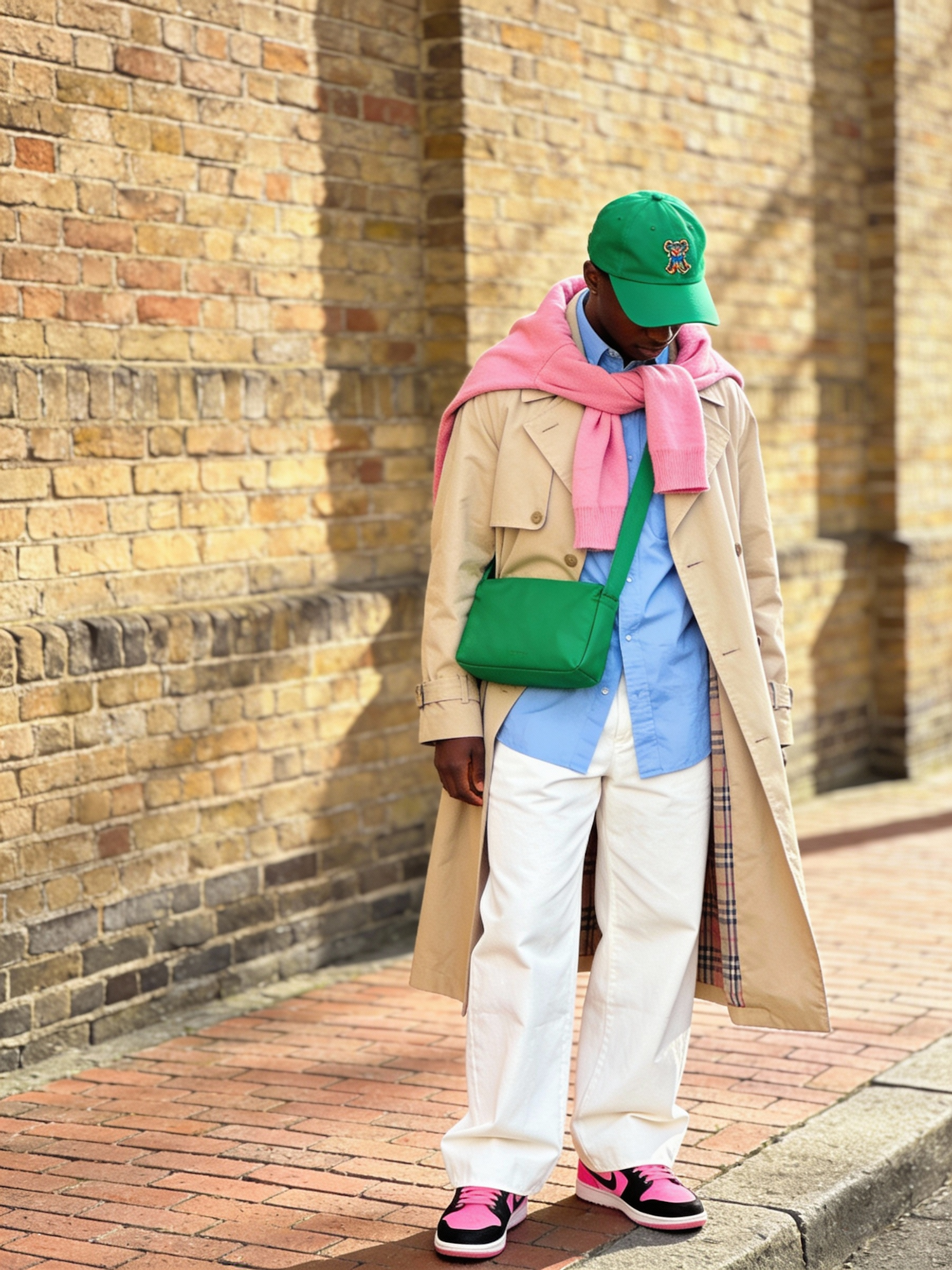 A fashion-forward Black individual stands on a brick-paved sidewalk in front of a textured brick wall, dressed in layered garments that blend casual streetwear with Scandinavian editorial minimalism. They wear a long beige trench coat over white wide-legged pants and a light blue shirt. A pink scarf is wrapped around the neck, paired with a green crossbody bag and a green baseball cap with embroidered detail. Pink and black sneakers complete the look. The subject’s head is slightly lowered, with the face partially obscured by the cap, adding a sense of quiet introspection. The lighting is soft and natural, casting gentle shadows across the outfit and the brick textures. The composition is editorial and composed, emphasizing color contrast, layering, and urban serenity