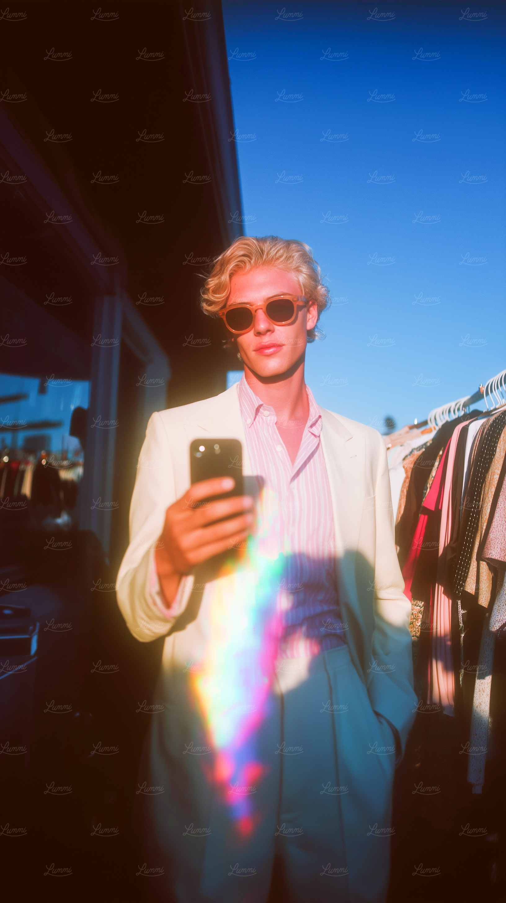 Stylish individual in a light suit and sunglasses holding a phone, with a colorful light reflection and a sunny outdoor setting.