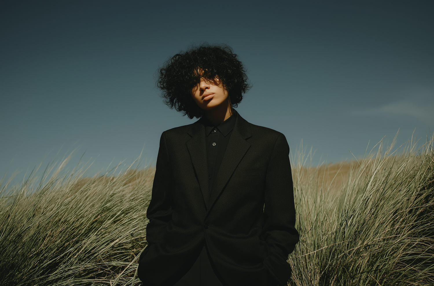 Stylish individual in a black suit standing in a serene outdoor setting with tall grass and a clear blue sky.