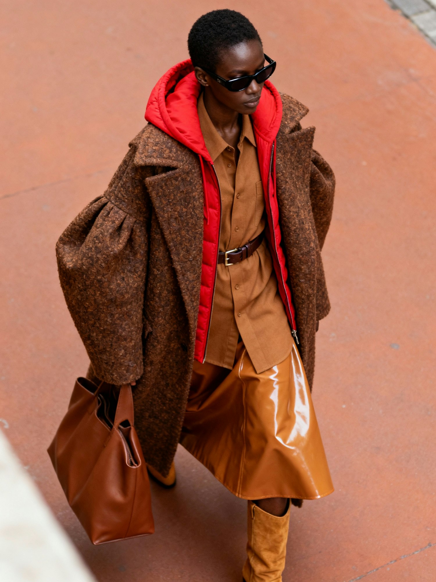 A fashionable person in a layered outfit with a brown coat, red hoodie, and caramel skirt, walking confidently with a leather tote bag.