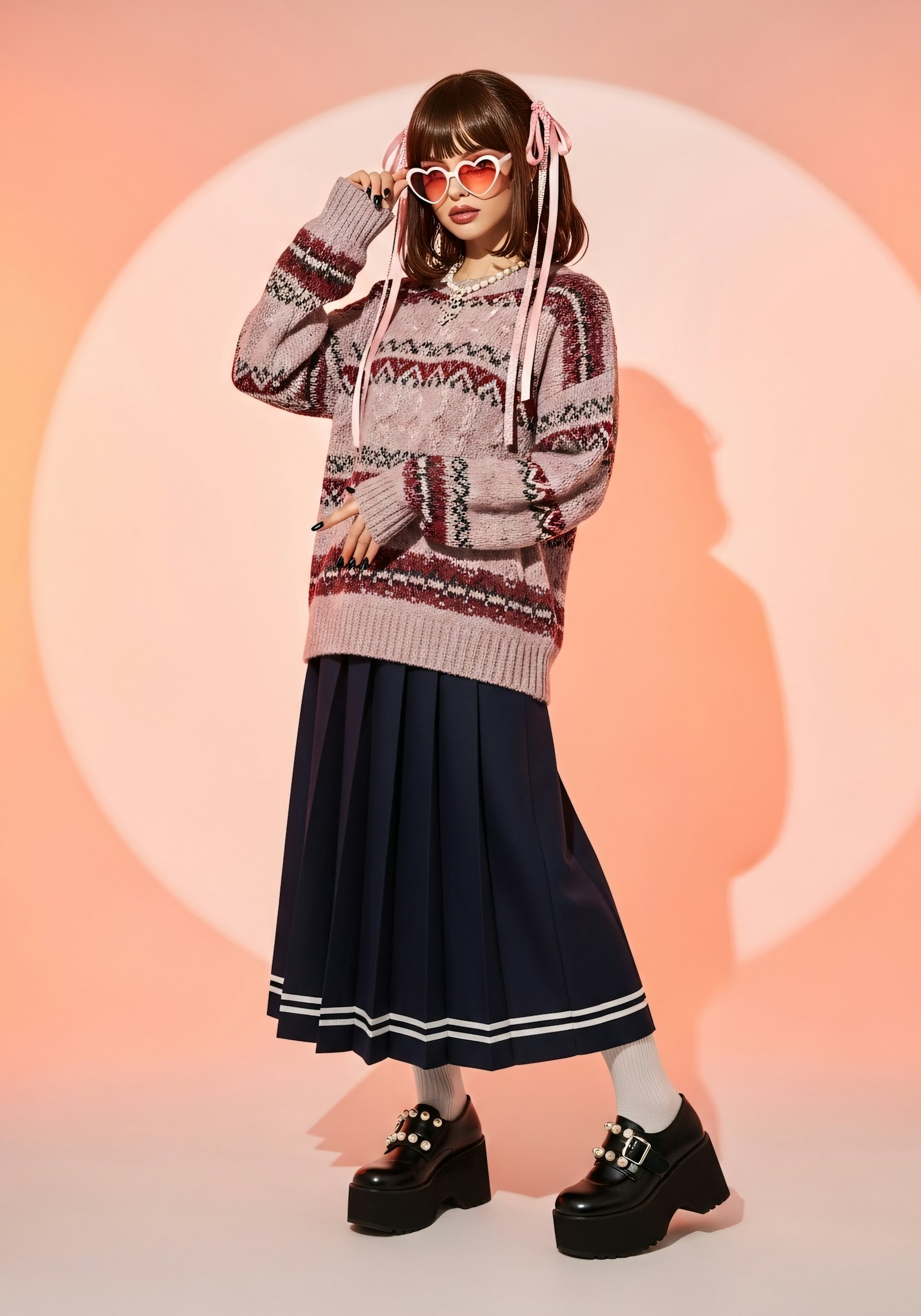 Stylish outfit with a pink sweater, navy pleated skirt, heart sunglasses, and platform shoes, set against a warm gradient background.