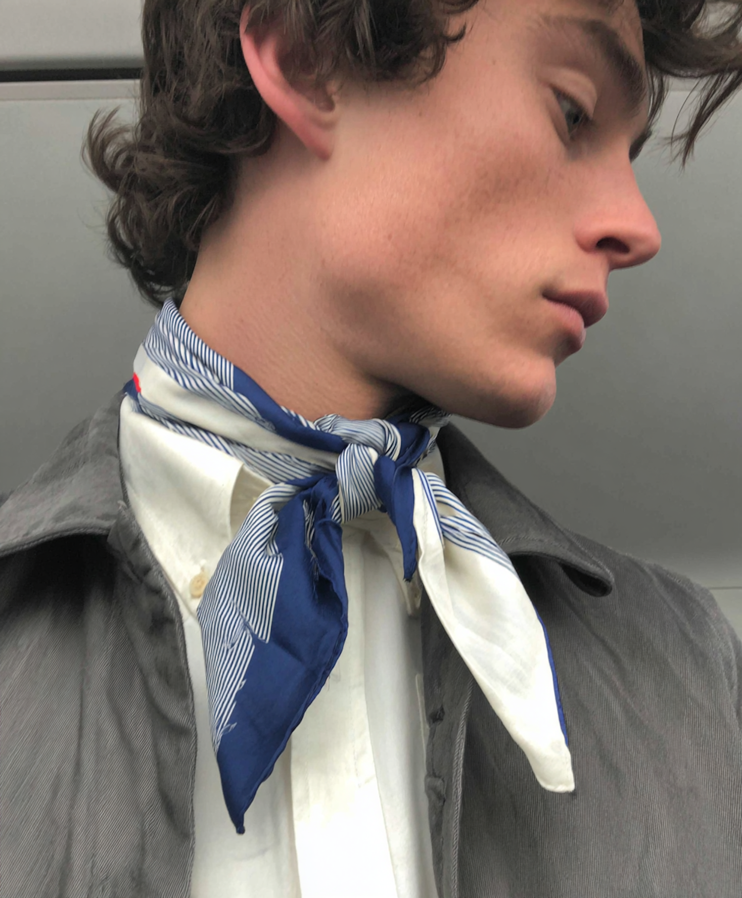 Close-up of a person wearing a white shirt, blue scarf, and gray jacket, showcasing a stylish and elegant look.