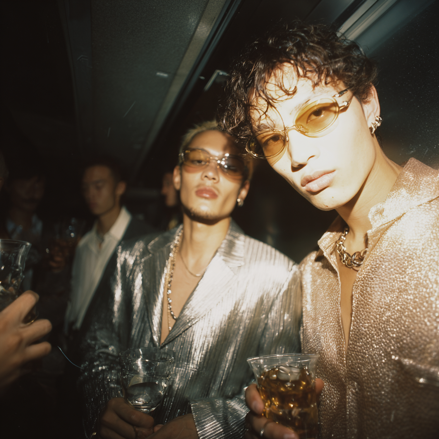 Two stylish individuals in metallic outfits and sunglasses enjoying drinks at a party, with a vibrant and lively atmosphere.