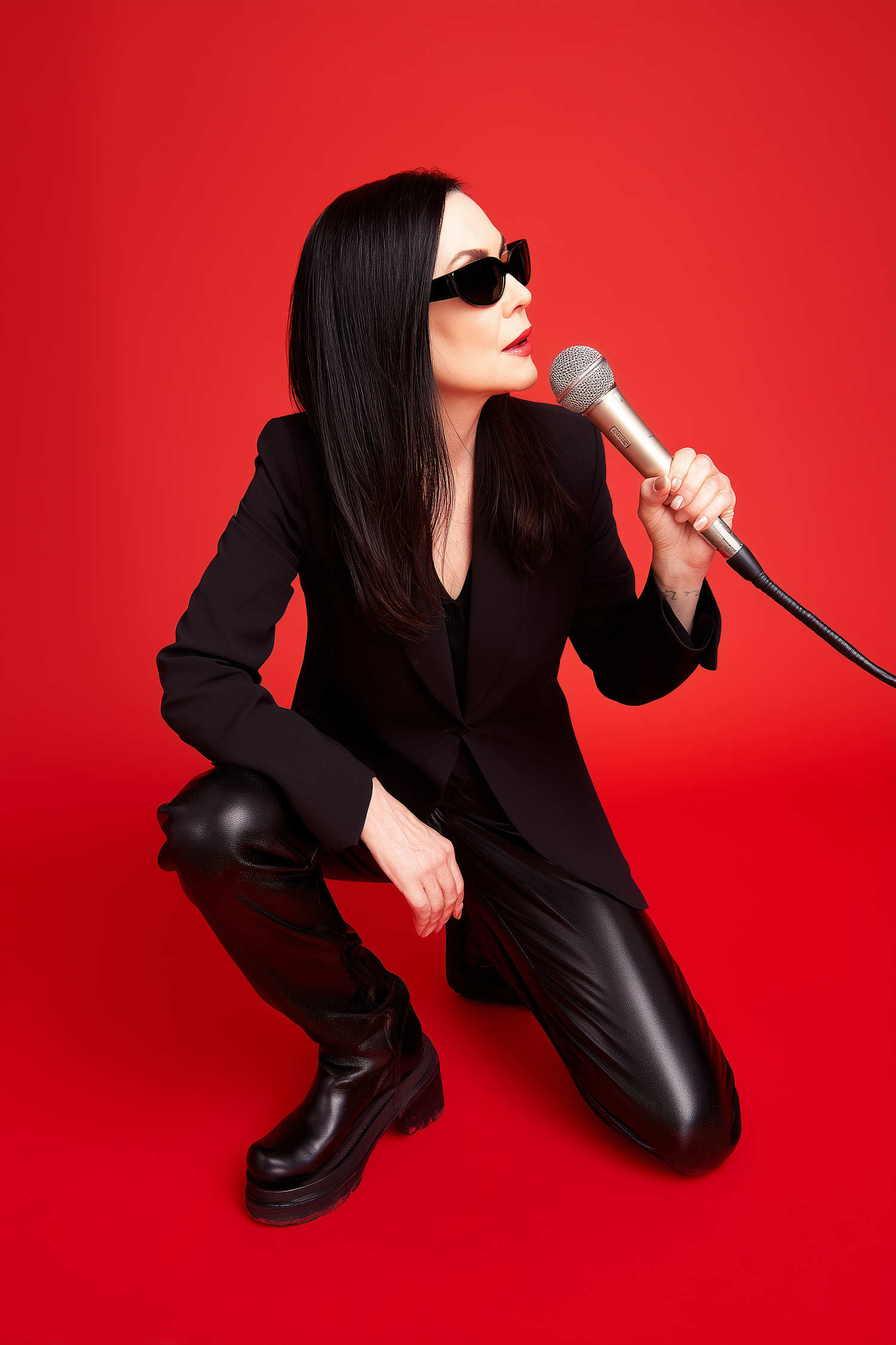 Stylish individual in black attire kneeling on a red background, holding a microphone, exuding a bold and confident vibe.