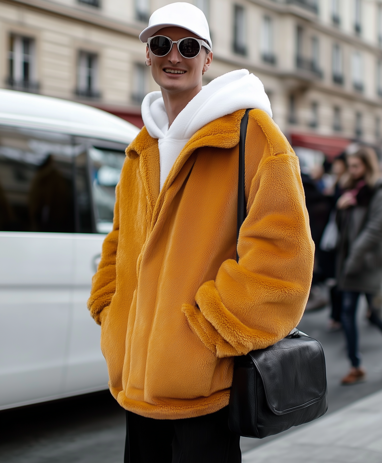 Stylish man in orange faux fur coat and sunglasses on a city street, exuding urban fashion vibes.