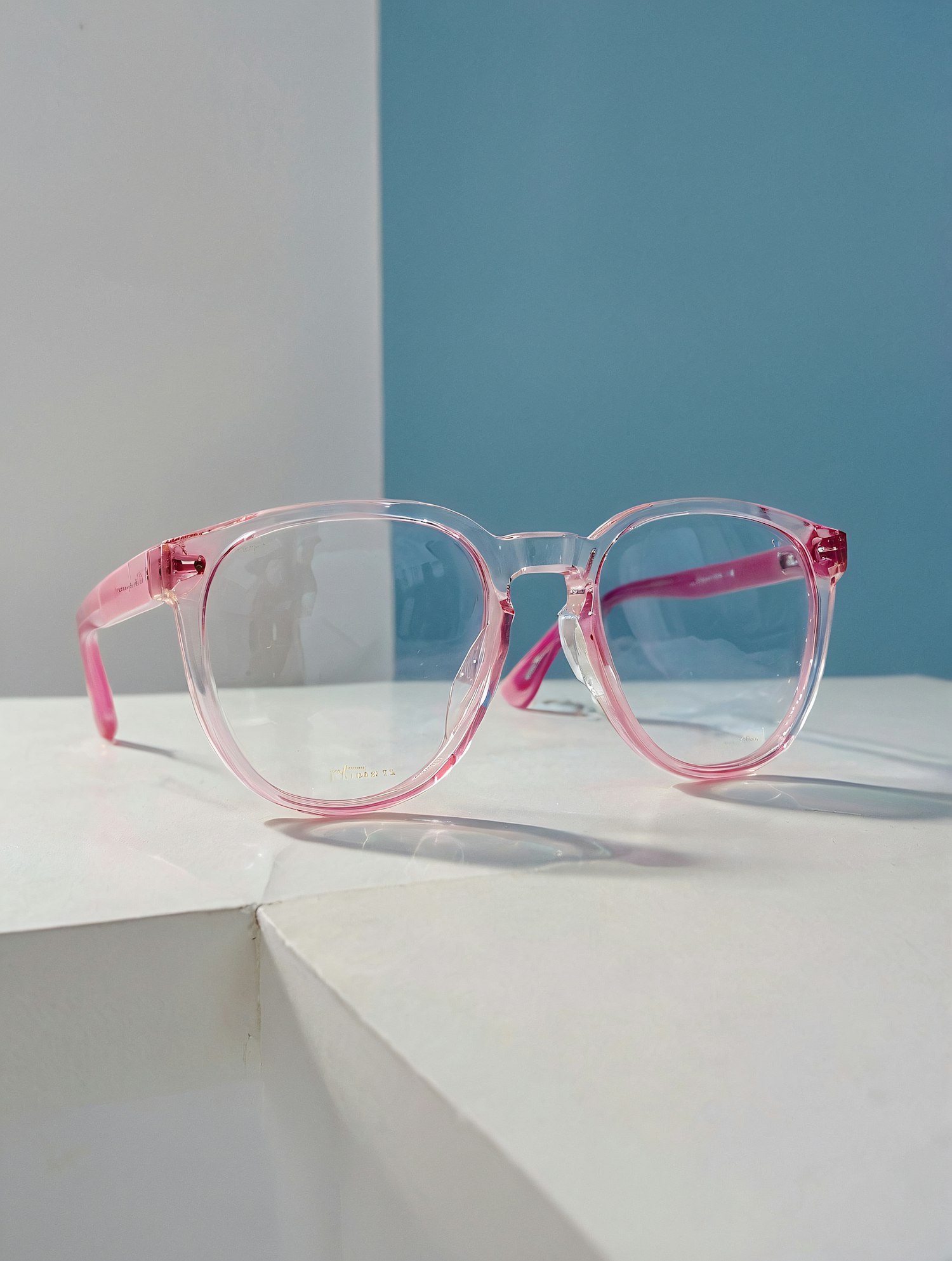 Trendy transparent pink eyeglasses with round frames on a white surface, set against a modern blue and gray background.