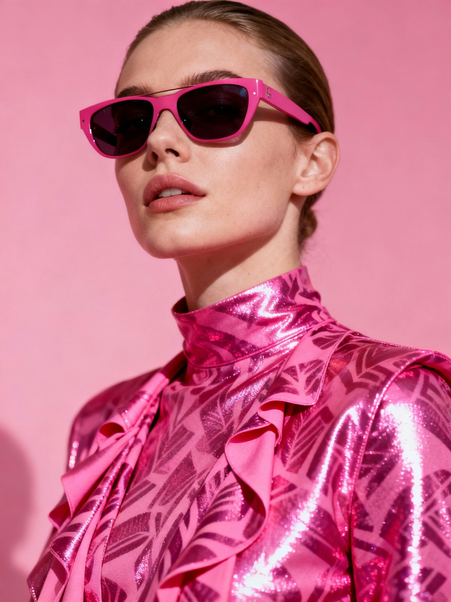 A person in pink sunglasses and a shiny patterned outfit against a pink background, showcasing bold fashion and vibrant colors.