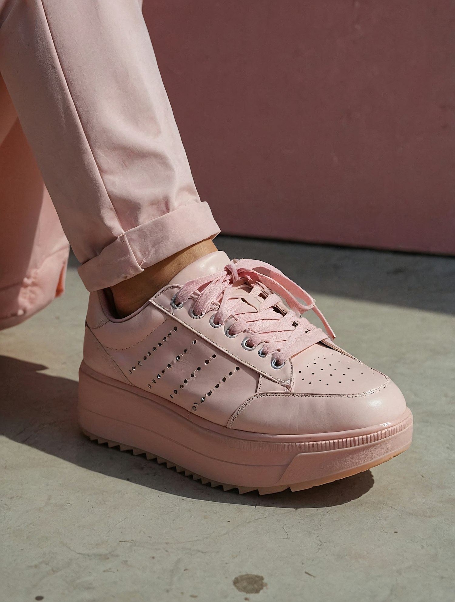 Trendy pink platform sneakers with perforated details and a thick sole, paired with rolled-up pink pants for a chic monochromatic look.
