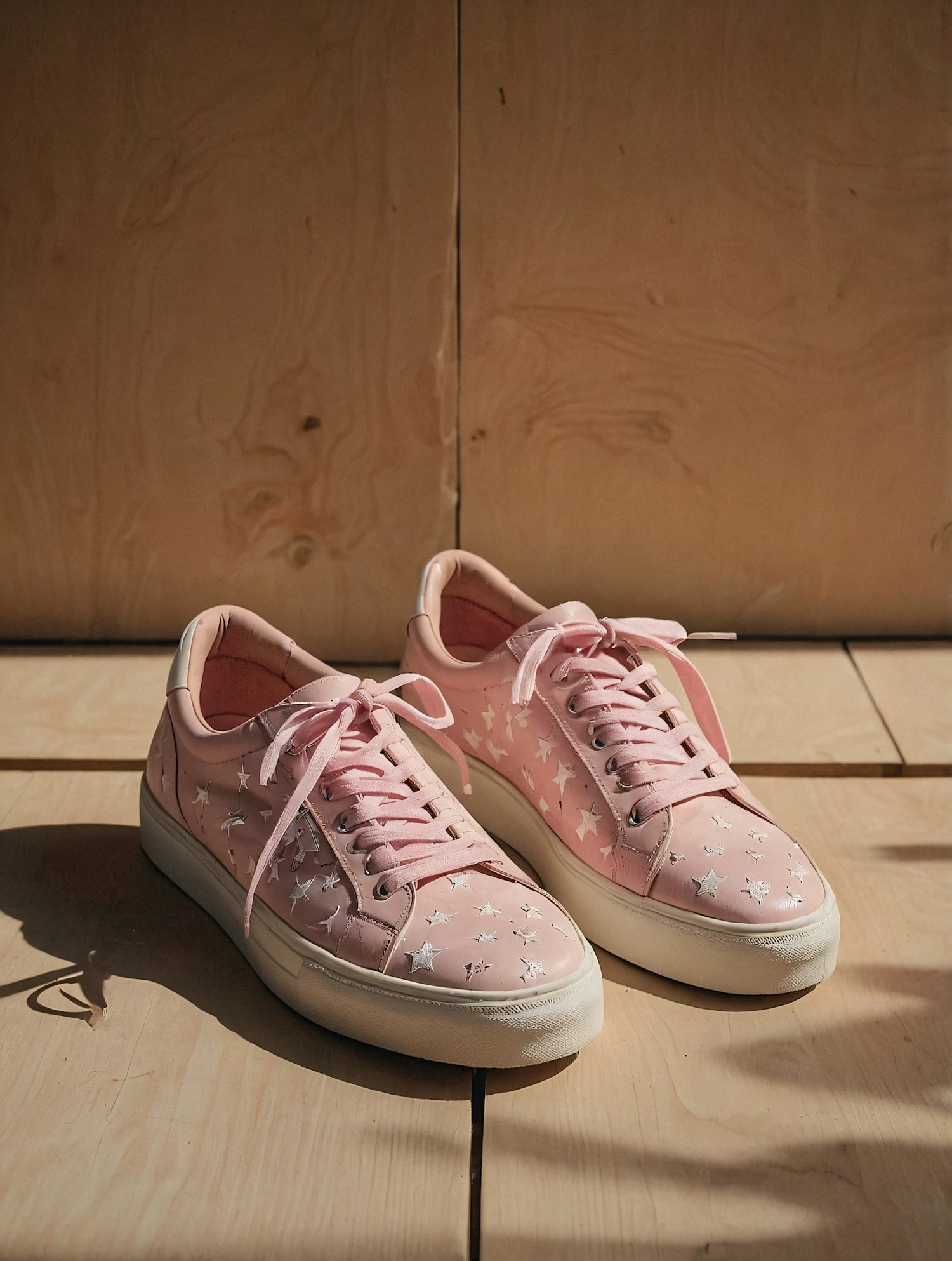 Trendy pink sneakers with white star patterns and thick white soles, placed on a wooden floor under warm sunlight.