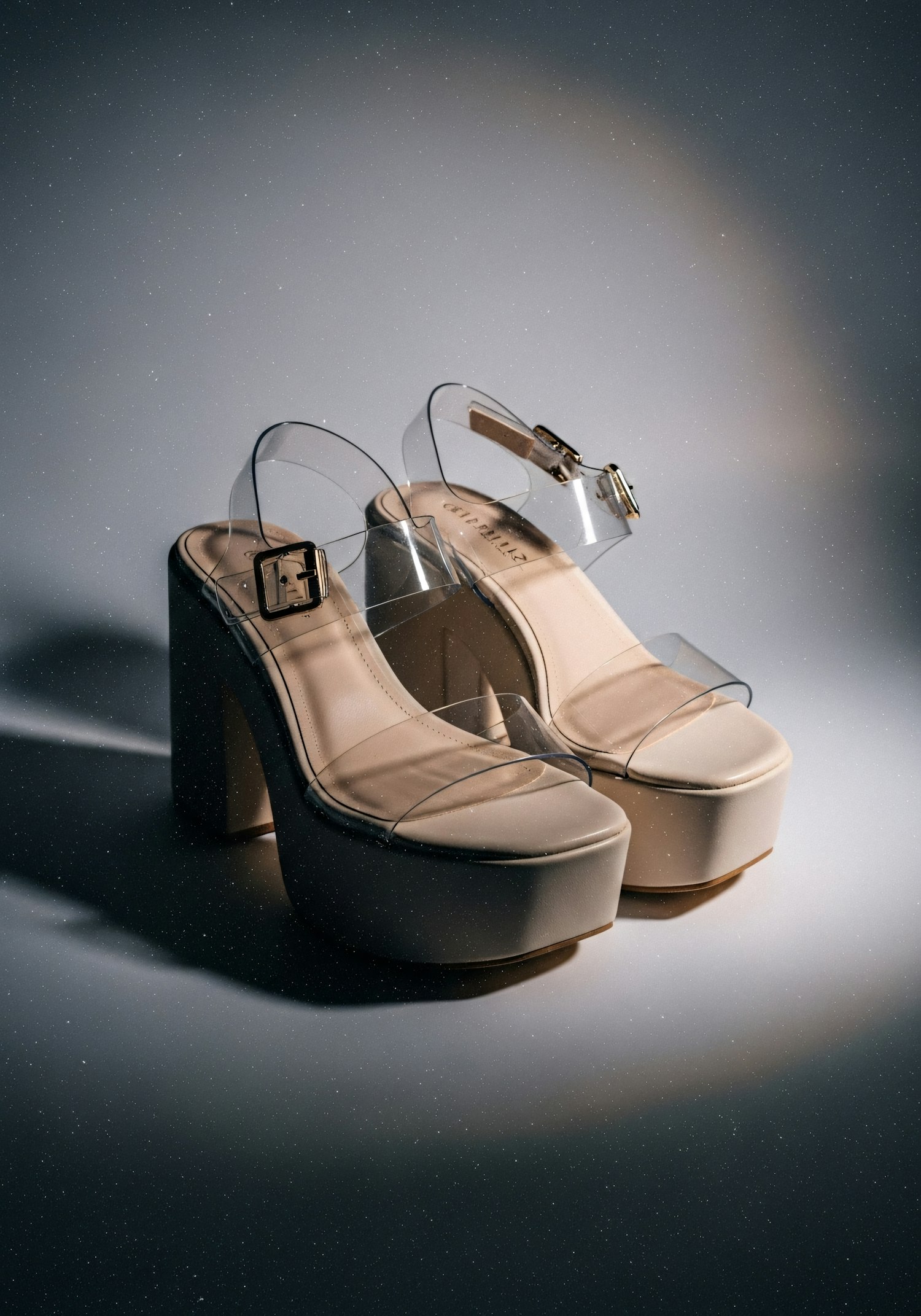 Stylish beige platform heels with transparent straps and metallic buckles, showcased against a softly lit neutral background.