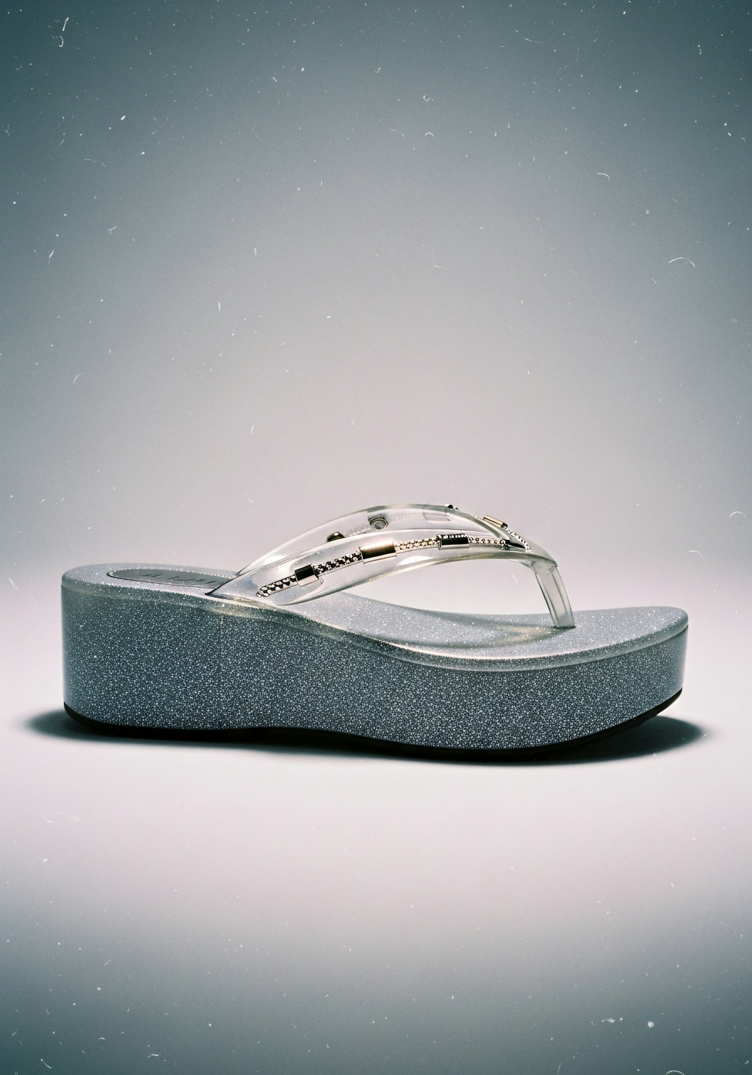 A glittery silver platform sandal with transparent straps and metallic accents, perfect for a chic and modern look.