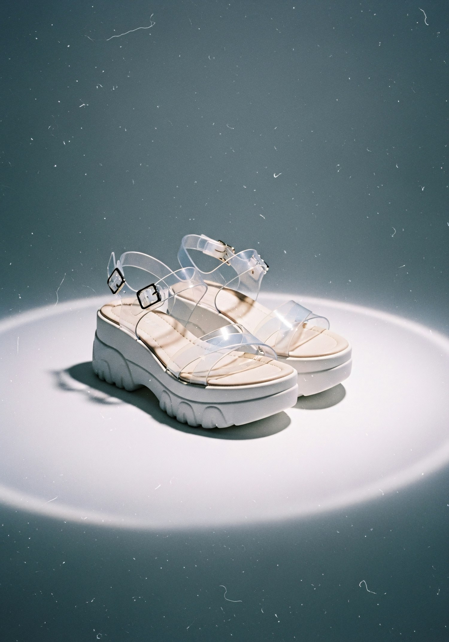 Stylish platform sandals with transparent straps and white textured soles, showcased under focused lighting for a modern aesthetic.