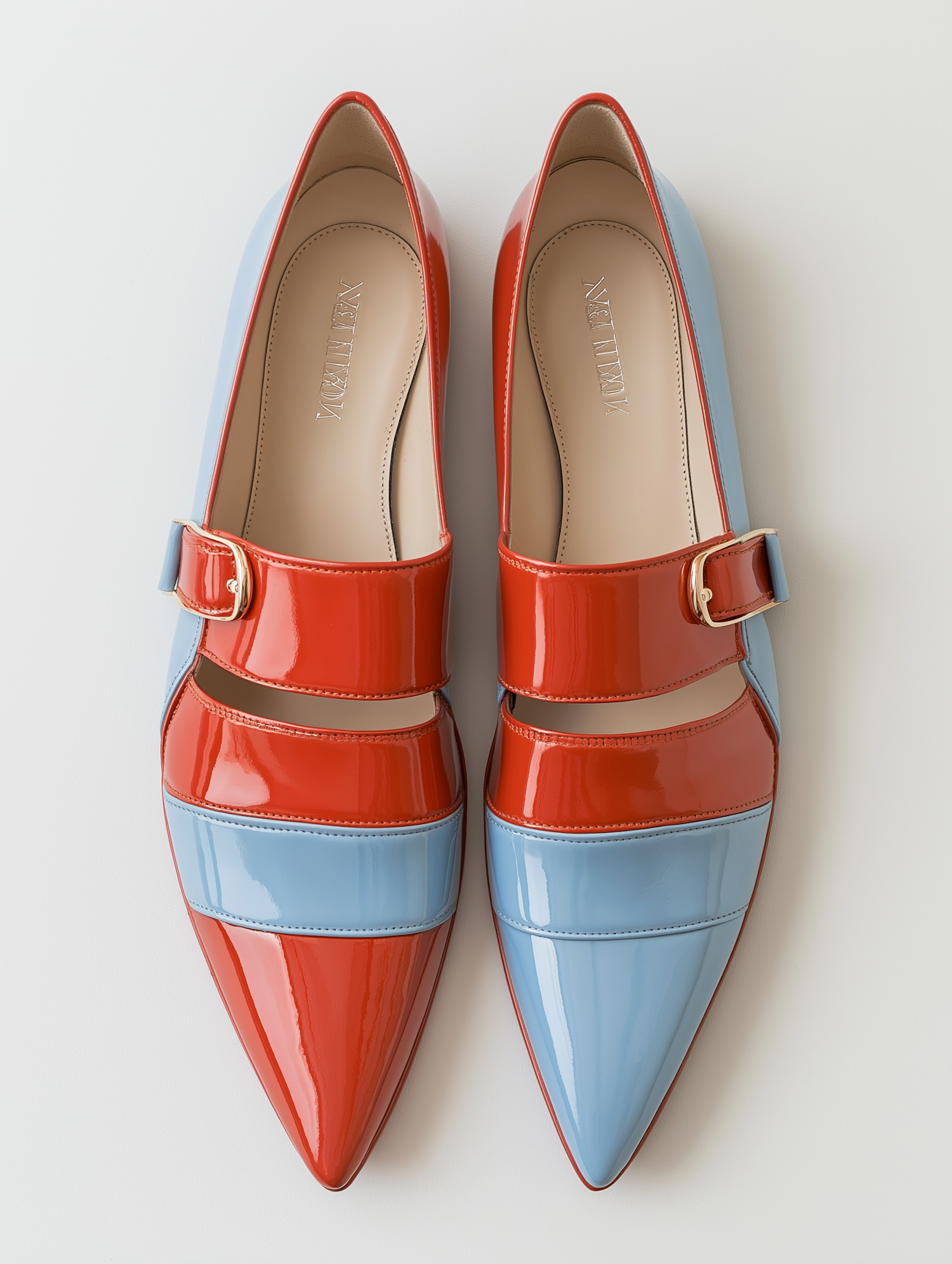 Stylish red and blue glossy shoes with a pointed toe and buckle strap, perfect for a bold fashion statement.