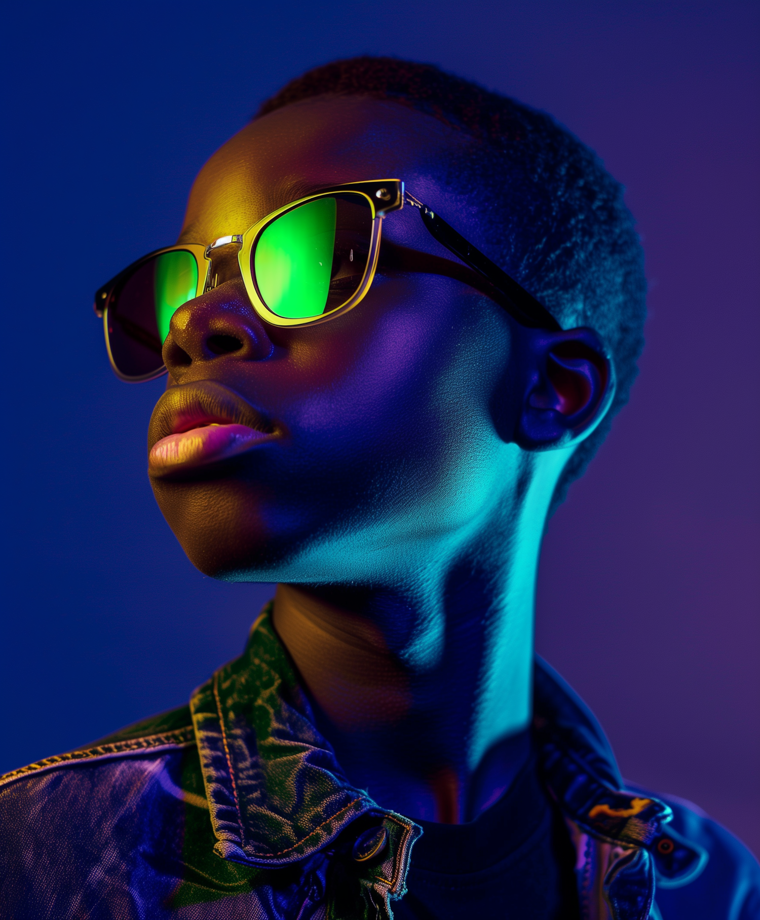 Stylish portrait of a person in reflective green sunglasses and denim, illuminated by vibrant blue and purple lighting.