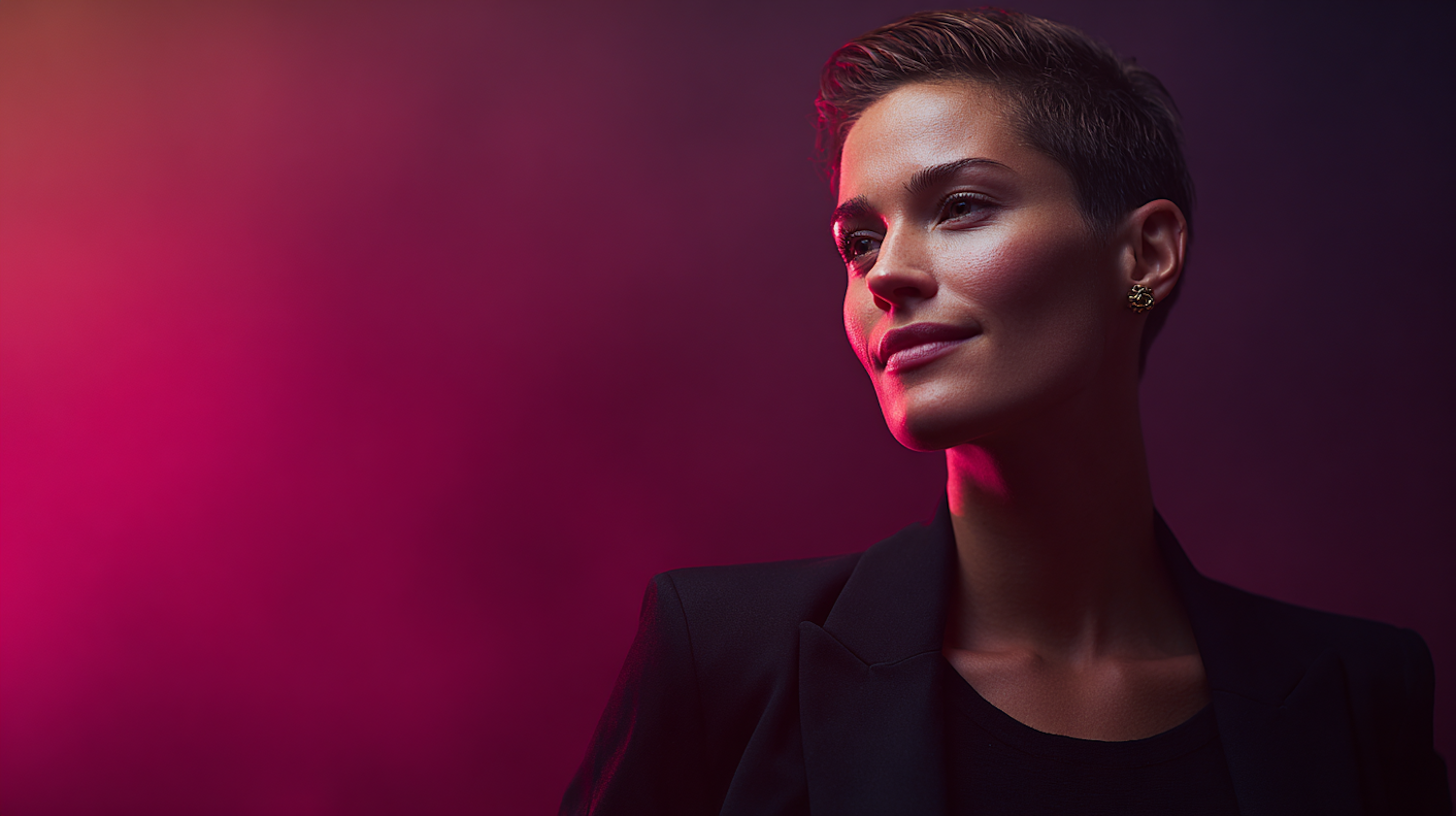 A striking portrait of a person with short hair, set against a vibrant pink and purple gradient background, exuding confidence and style.