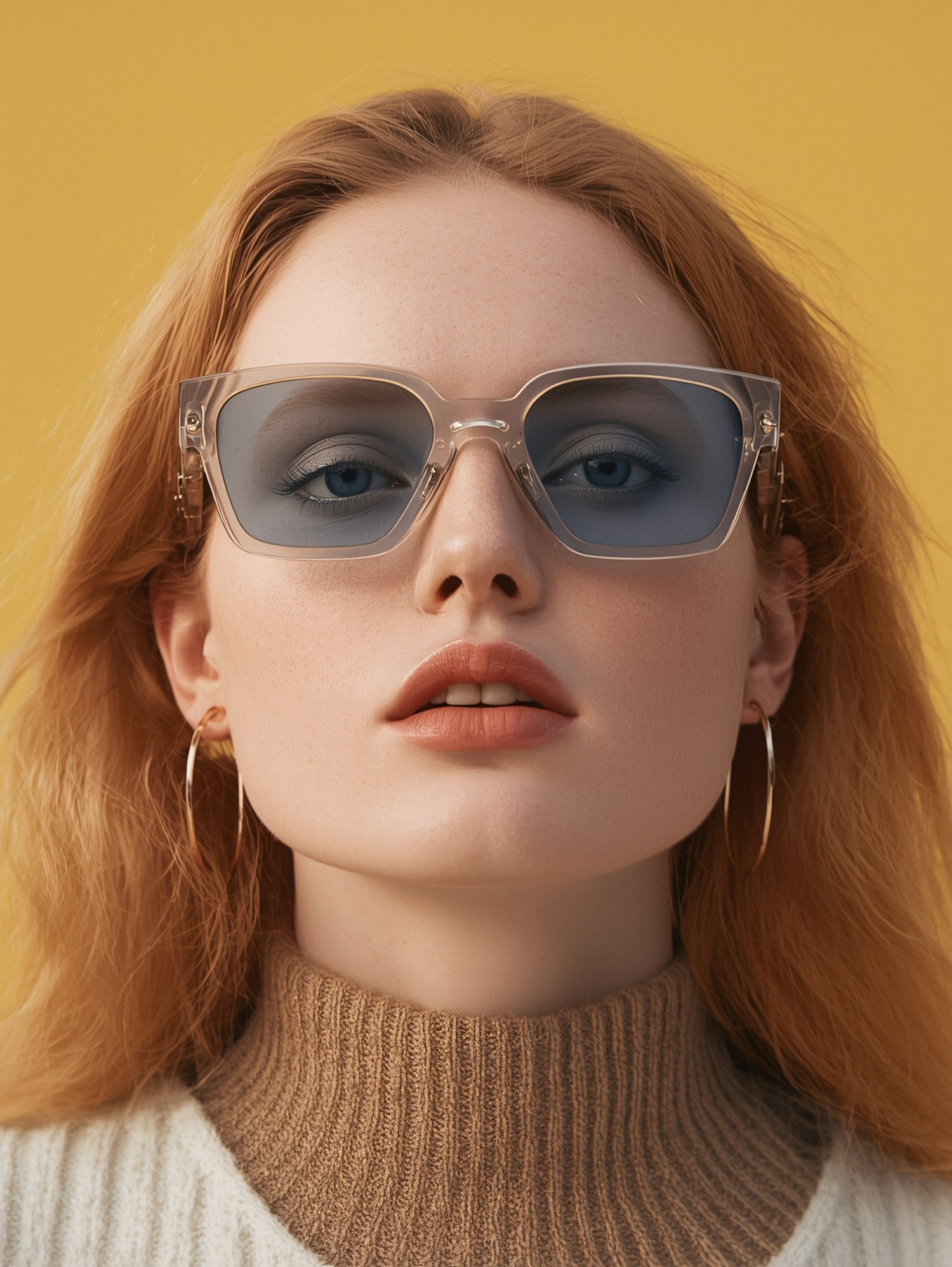 Stylish portrait of a red-haired individual in oversized sunglasses, gold hoop earrings, and a beige turtleneck against a yellow backdrop.