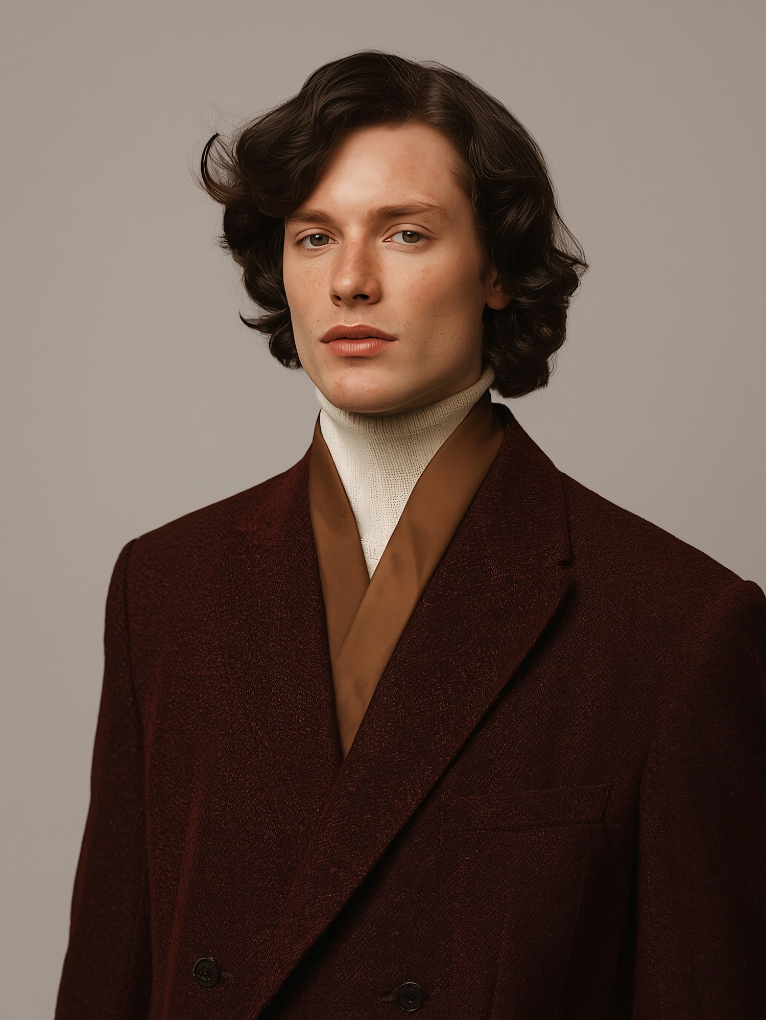 A stylish individual in a burgundy blazer and white turtleneck, set against a neutral background, showcasing elegance and sophistication.