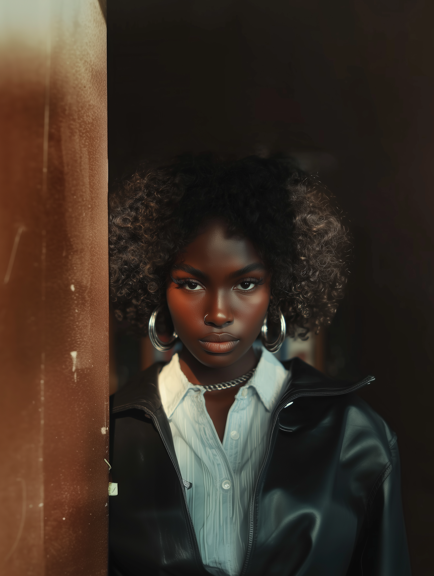 A striking portrait of a person with dark curly hair, jewelry, and a leather jacket against a dramatized, warm-lit background.