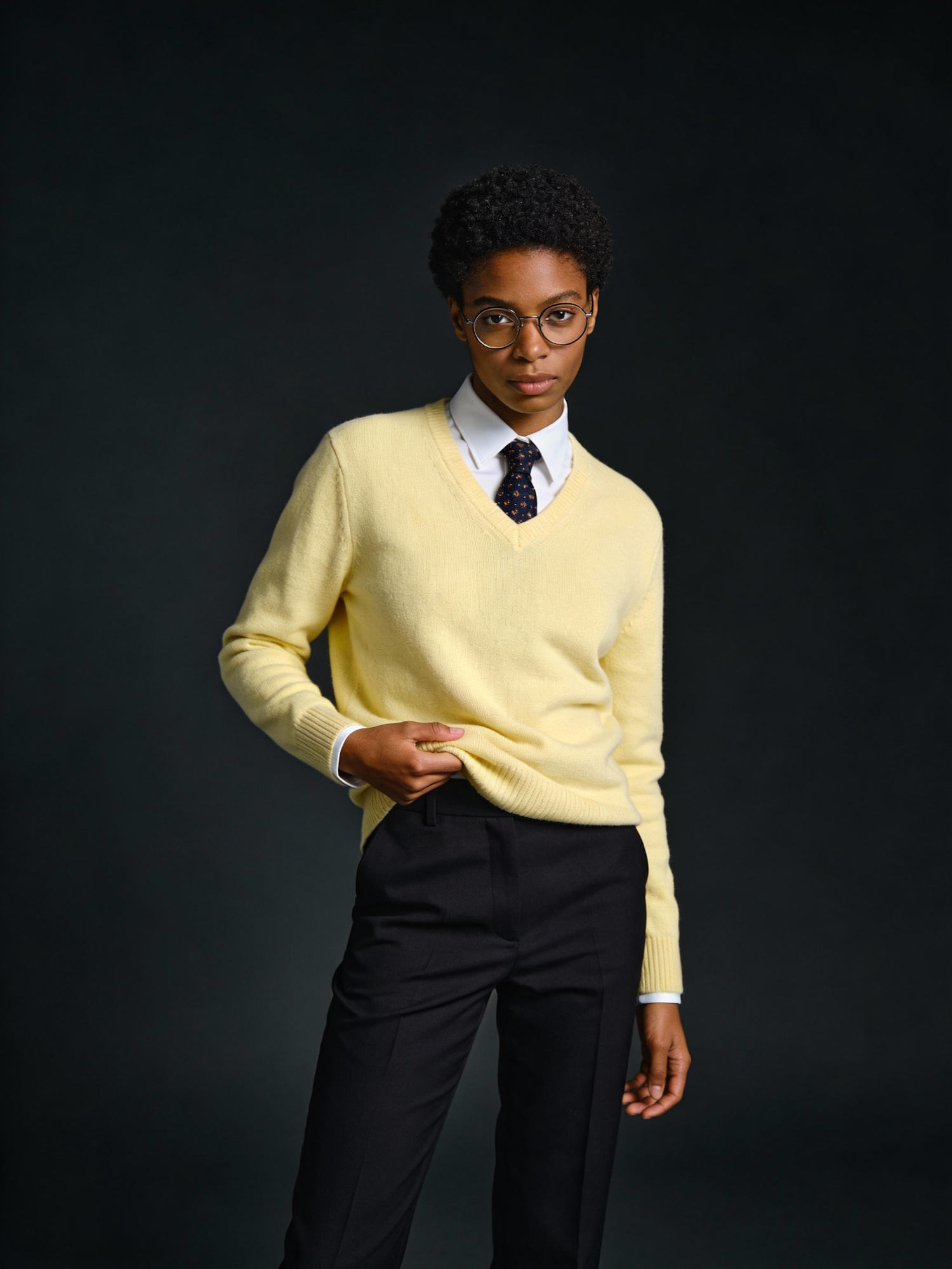 A person in a yellow sweater, white shirt, and black trousers poses confidently in a studio setting with a dark background.