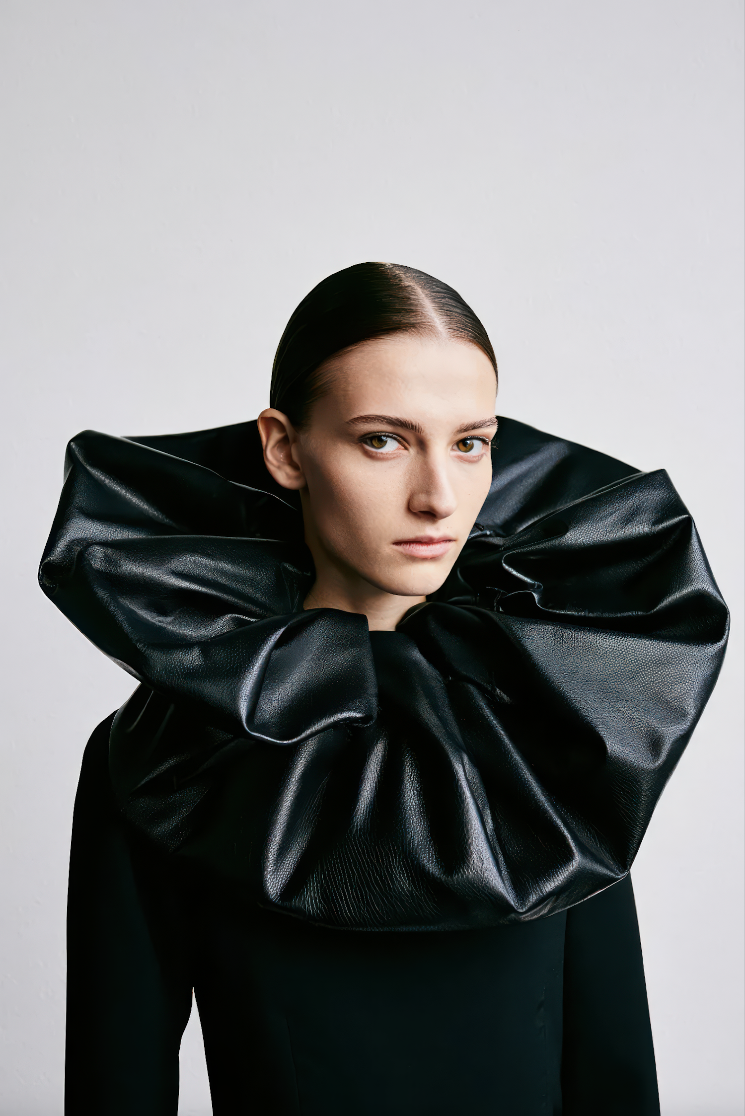 A person in a sleek black outfit with a dramatic oversized collar, set against a plain background, exuding modern elegance.