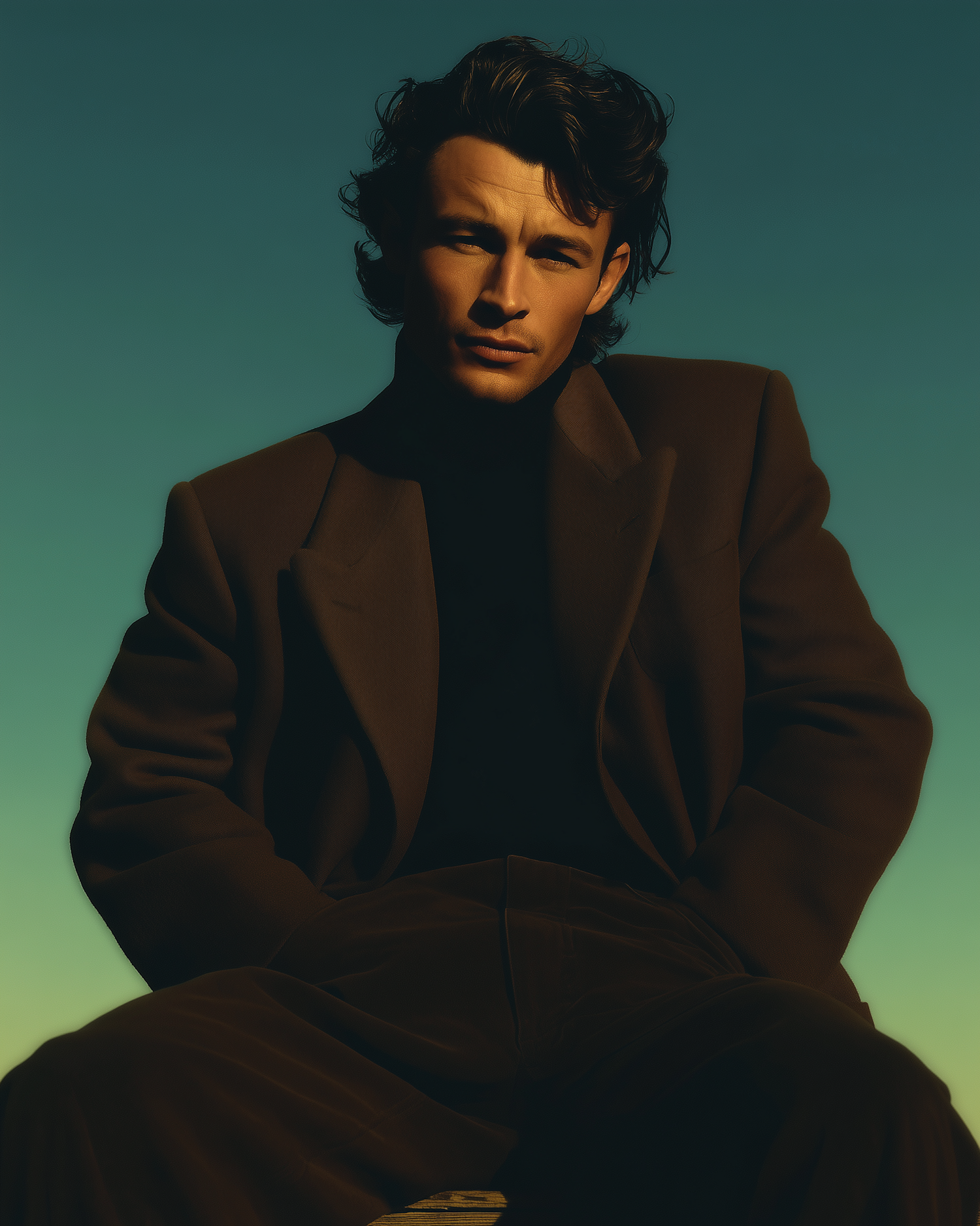 A man in a dark suit and turtleneck sits against a teal-to-green gradient background, with dramatic lighting highlighting his features.