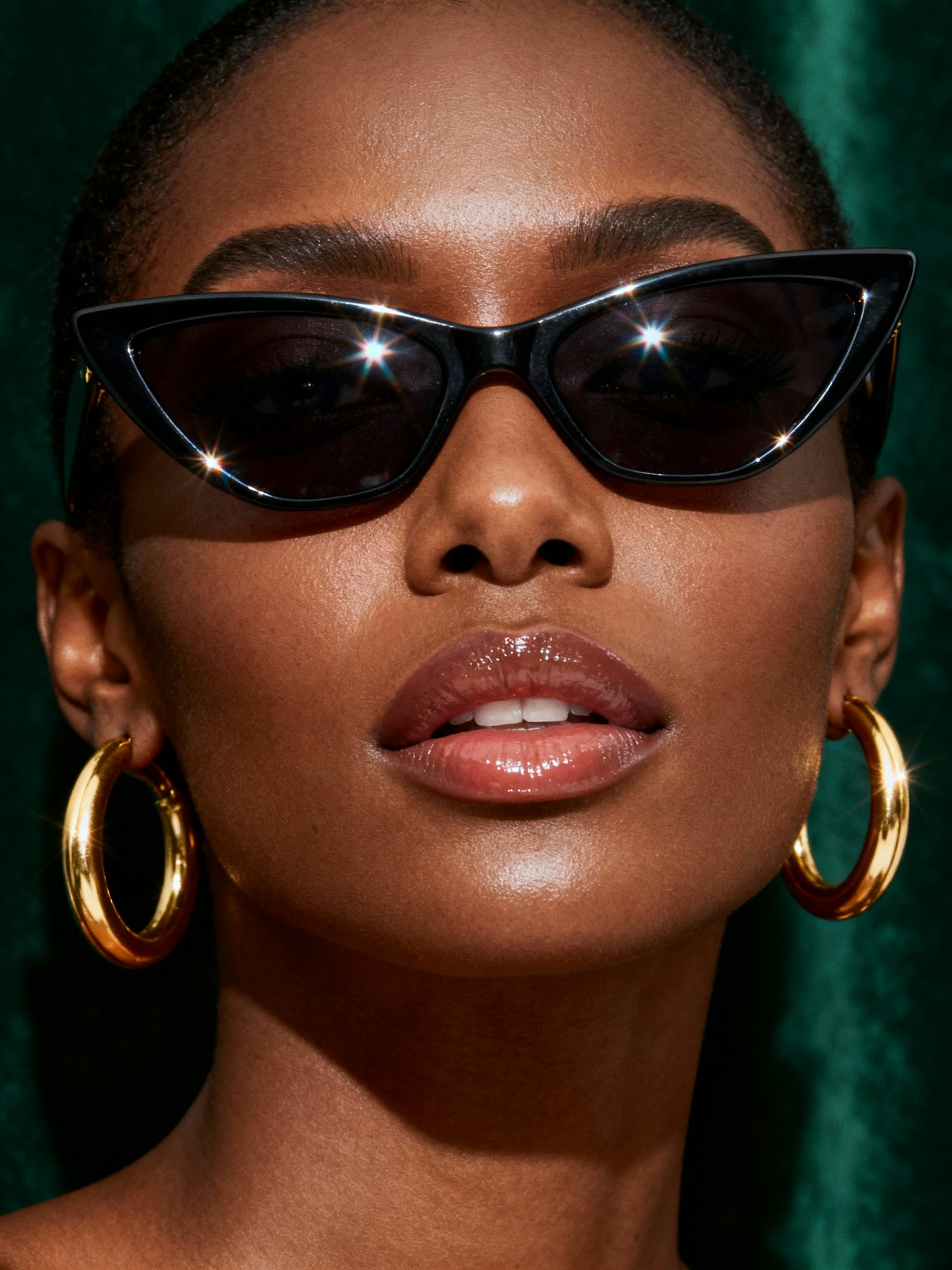 Cinematic close-up portrait of a stylish Black woman with flawless, glowing skin, wearing sharp cat-eye sunglasses and bold gold hoop earrings. Her expression is poised and confident, her face softly illuminated to highlight her contours and warm undertones with a glossy lip. She stands against a deep, velvety dark-green background that complements her accessories and adds depth to the frame. Subtle specular highlights dance across the sunglasses and earrings, creating an elegant, editorial mood... a striking high-fashion beauty portrait.
