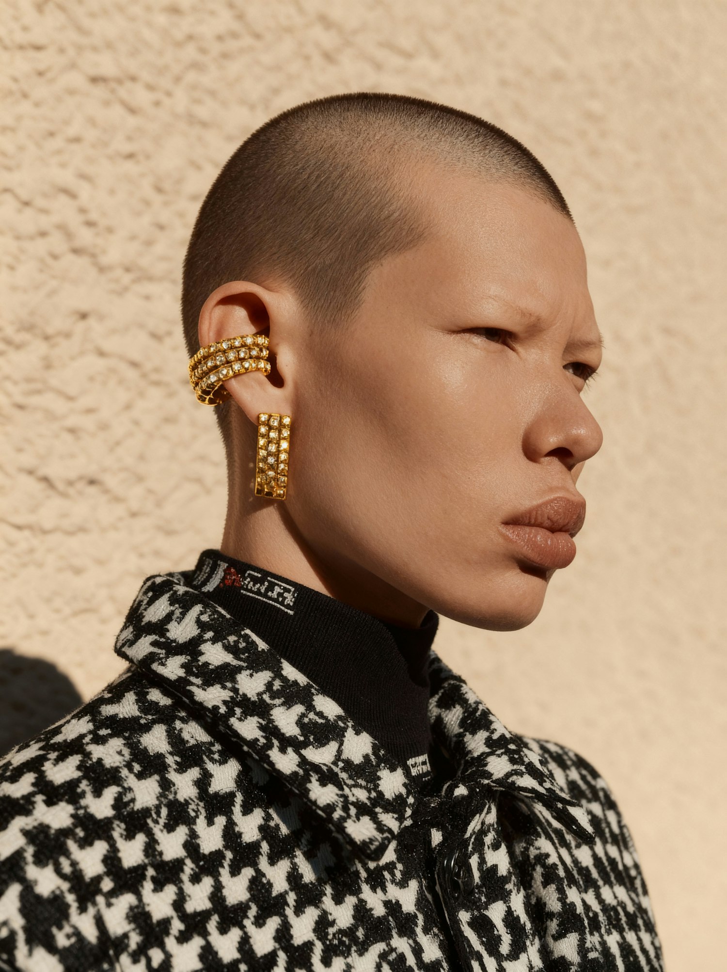 Close-up of a person with shaved head, wearing gold jewelry and a houndstooth jacket, set against a beige textured wall.