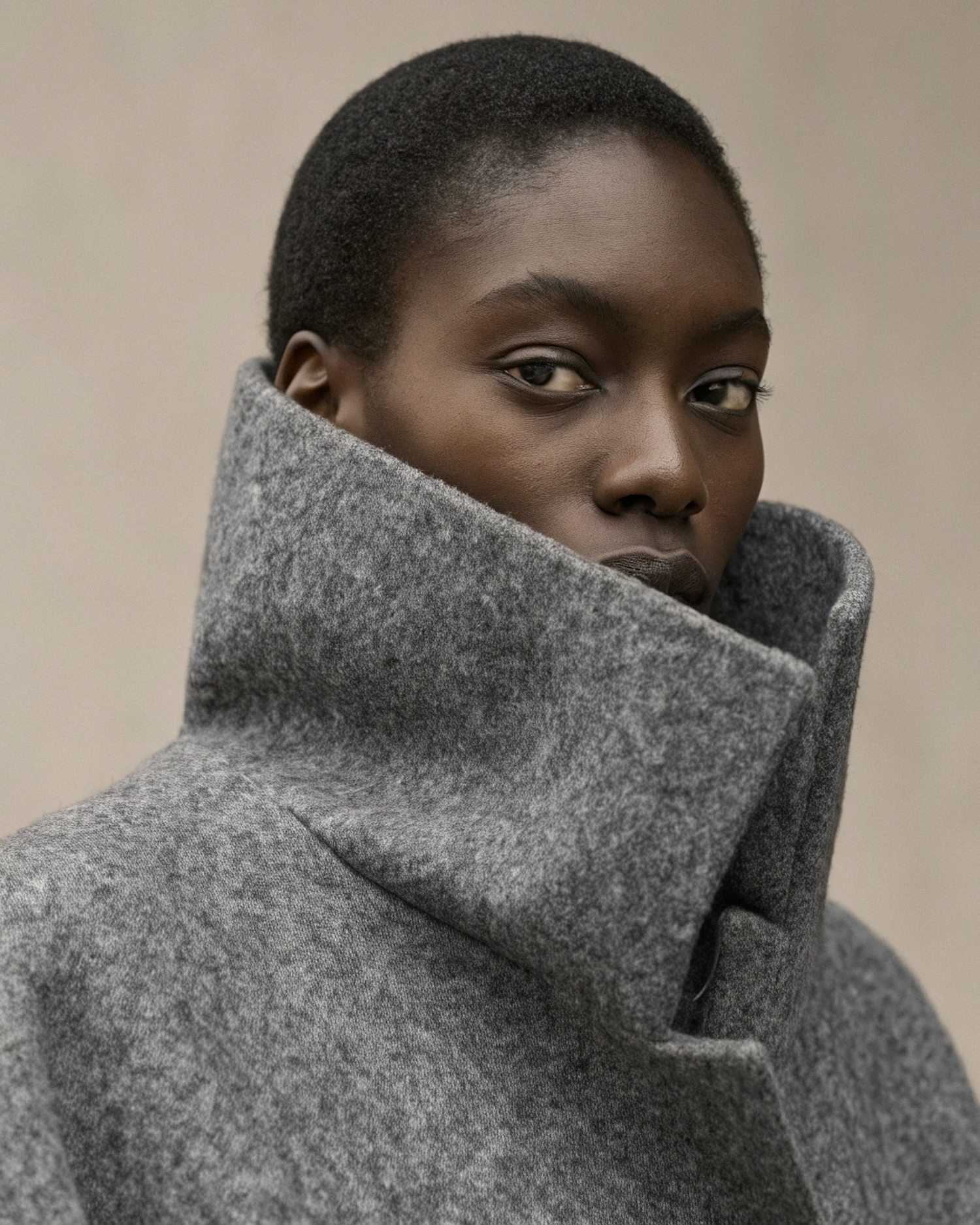 Close-up of a woman in a high-collared gray coat, with a neutral background and soft lighting highlighting her features and the fabric texture.