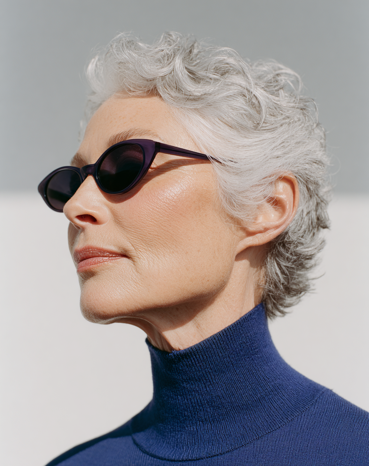 Stylish portrait of a person with white hair, dark sunglasses, and a blue turtleneck, set against a neutral background.