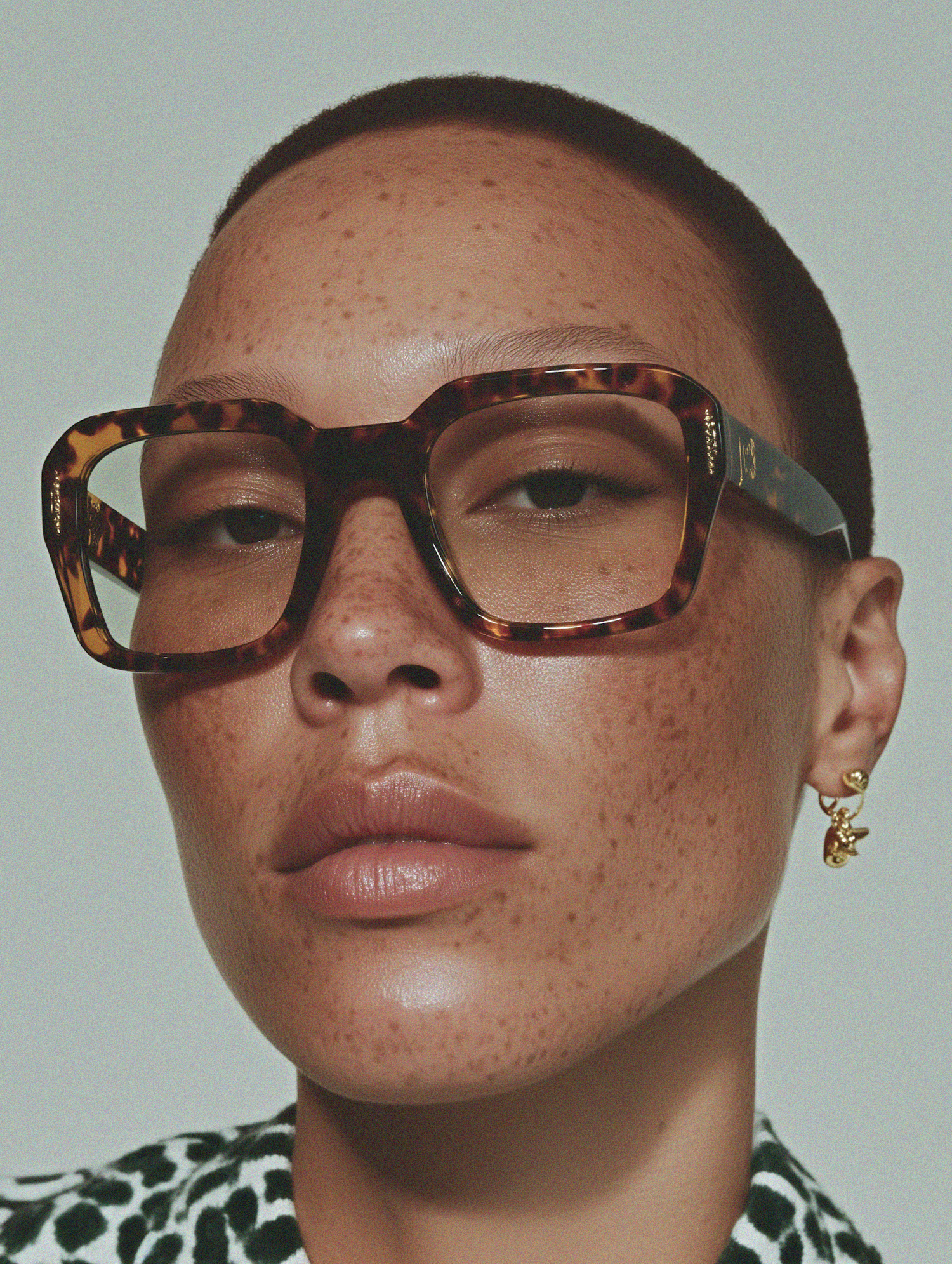 Close-up of a person with freckles, wearing bold tortoiseshell glasses and gold earrings, showcasing a chic and modern look.